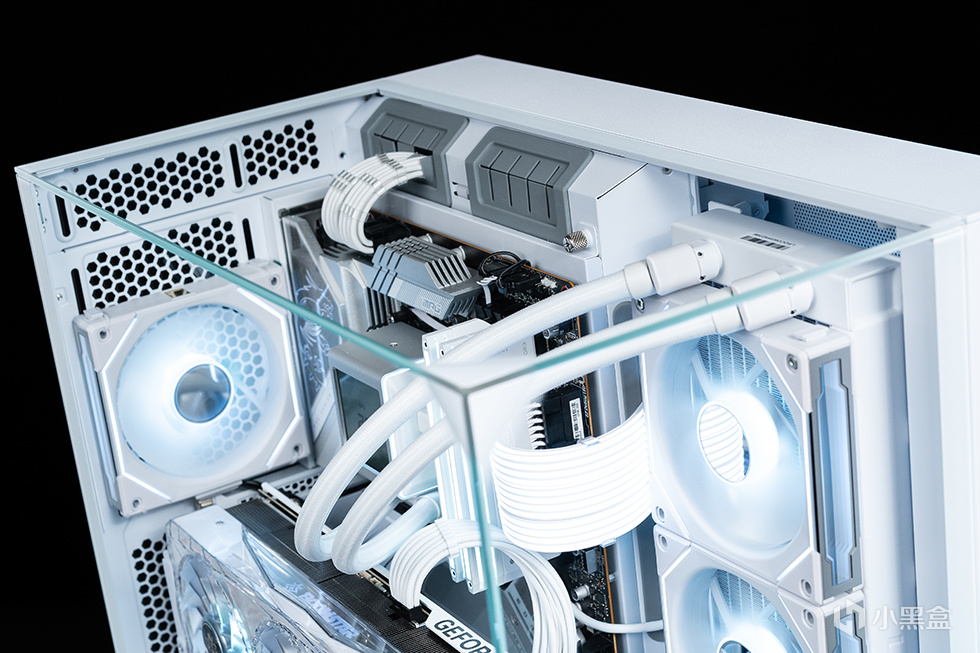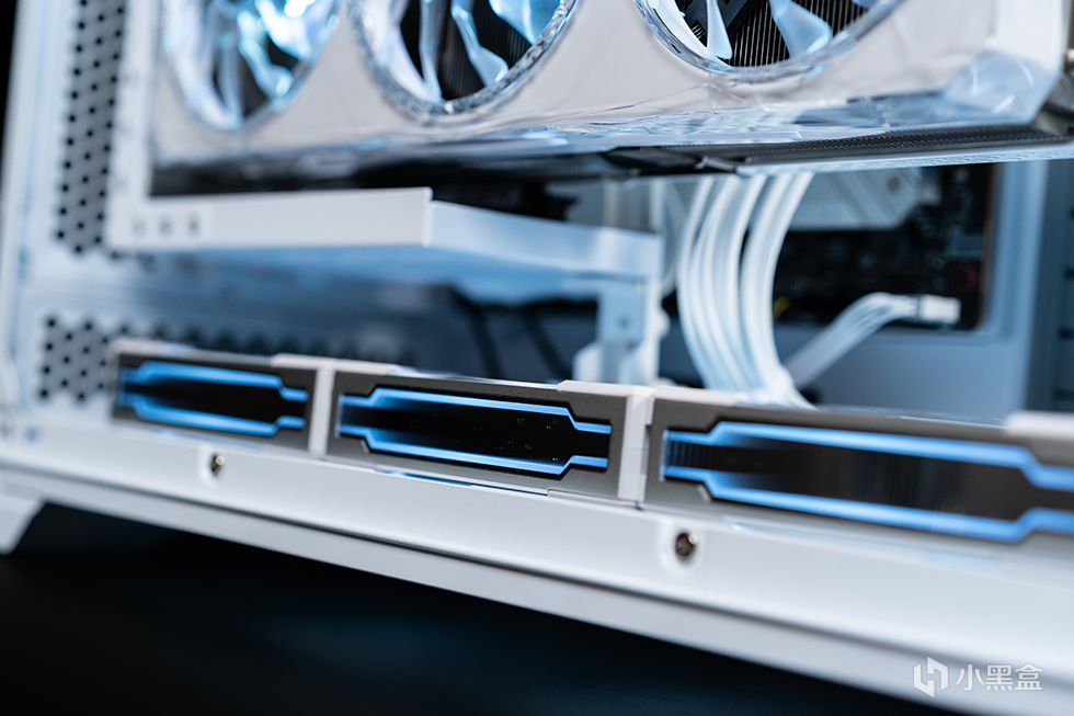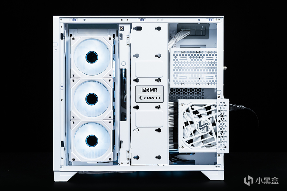 背倉視角,左側的冷排位加裝了三顆風扇,進一步加大進風效能,中間寬大的理線倉蓋板兼顧了SSD支架的作用,同時磁吸的開合方式很好的將凌亂的線纜“一網打盡”。