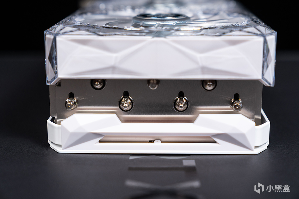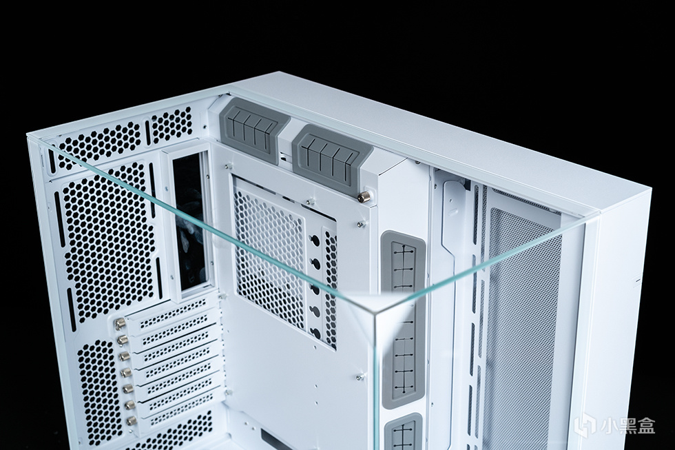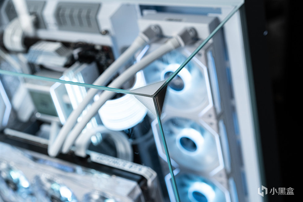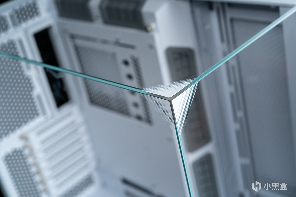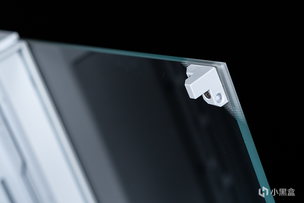 機箱正面與左側玻璃面板的接合處邊緣採斜角處理,讓視覺障礙降到最低。三篇玻璃通過一個三角緊固連接件進行匯聚安裝,連接件能夠讓玻璃面板對齊並有磁性支撐,三片側板玻璃的頂角位置通過絲網印刷工藝,做了三角形灰白漸層,將連接件的視覺弱化。
