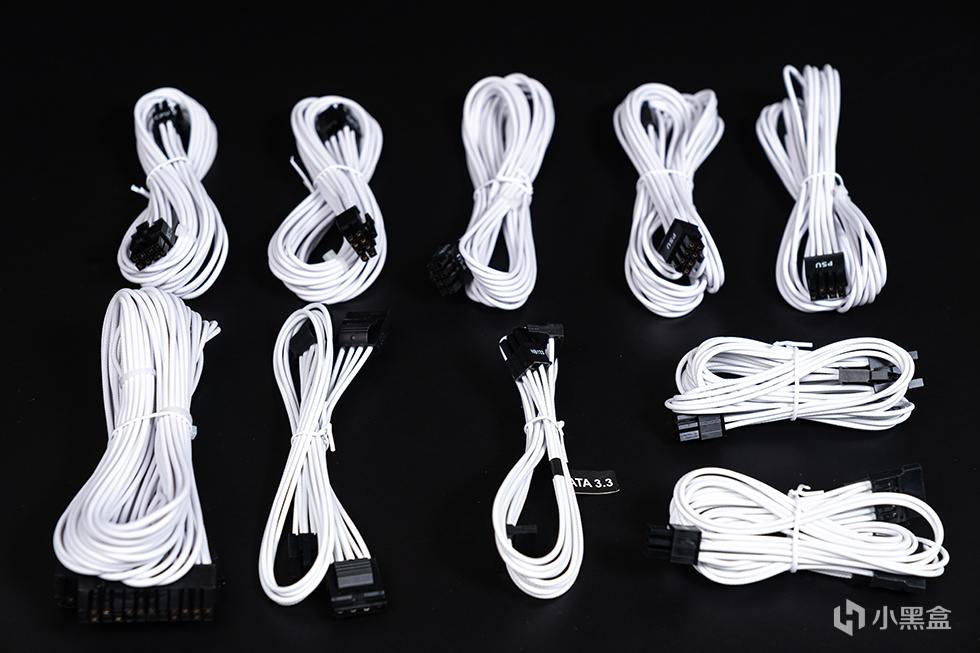 FOCUS GX-1000 (ATX3.0) 電源的模組線採用表面採用壓紋工藝,細緻如編織質感,比普通模組線更軟,易幹彎折方便走線,裝機更美觀用料方面。其中原生pcle 5.0 12VHPWR 16-pin接口 模組線使用16AWG高規格線徑,9.2A耐高電流合金銅端子,溫升低、導電強,輸出更穩。
