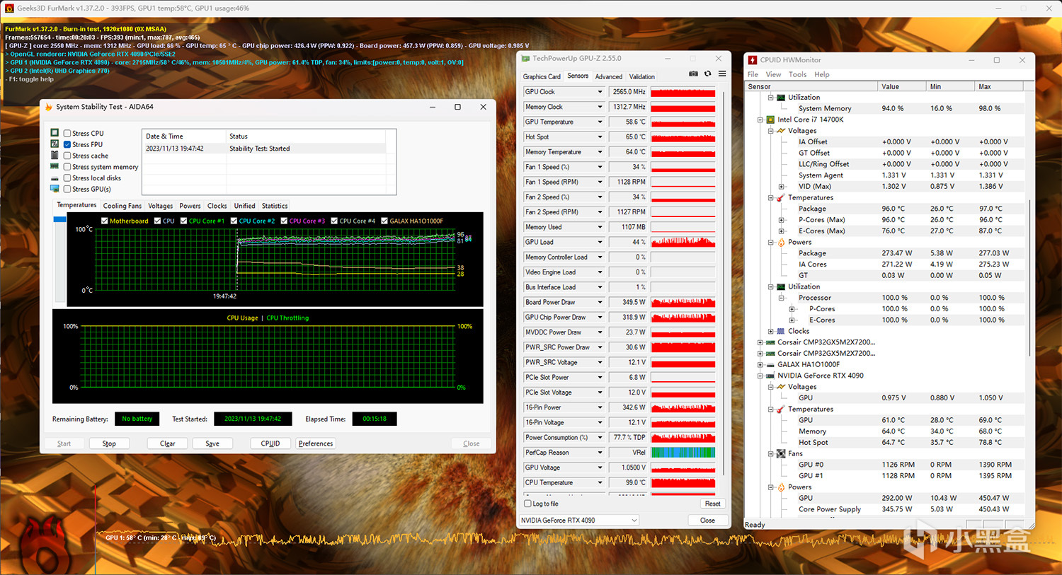 首先是雙烤溫度測試,AIDA64 FPU & Furmark 15分鐘,CPU功耗最高溫度275W,最高溫度96℃,顯卡溫度61℃。