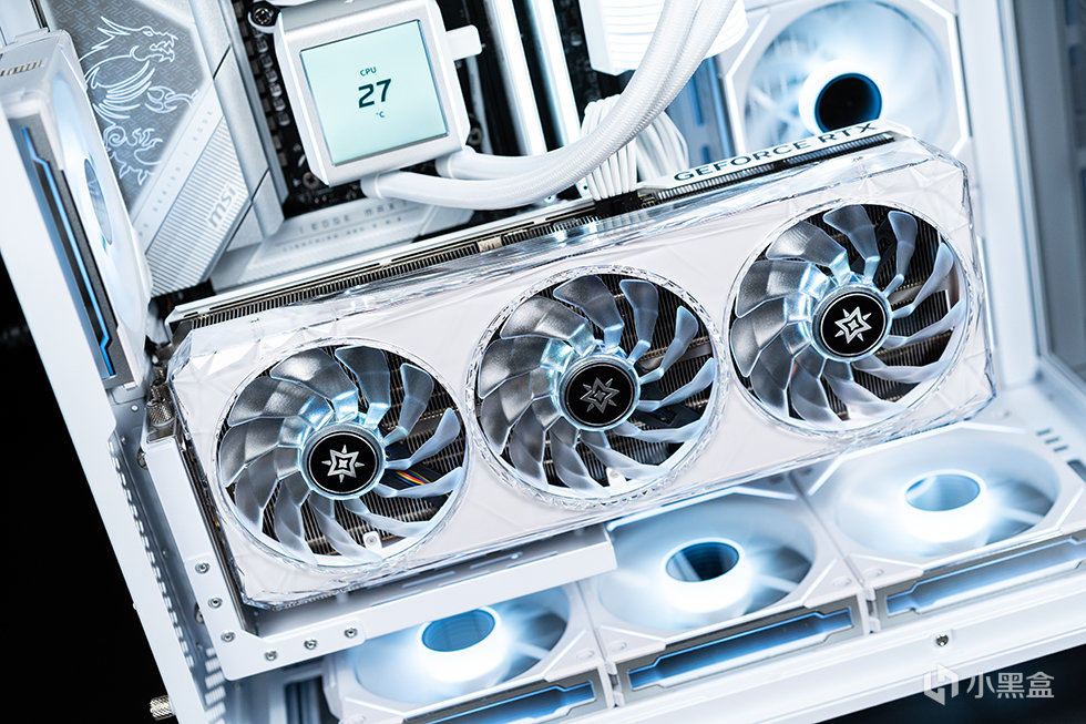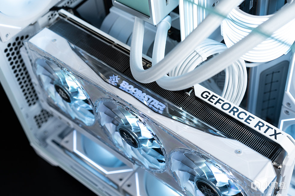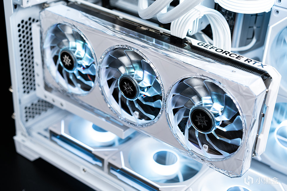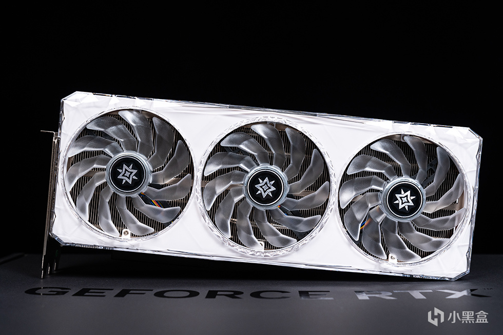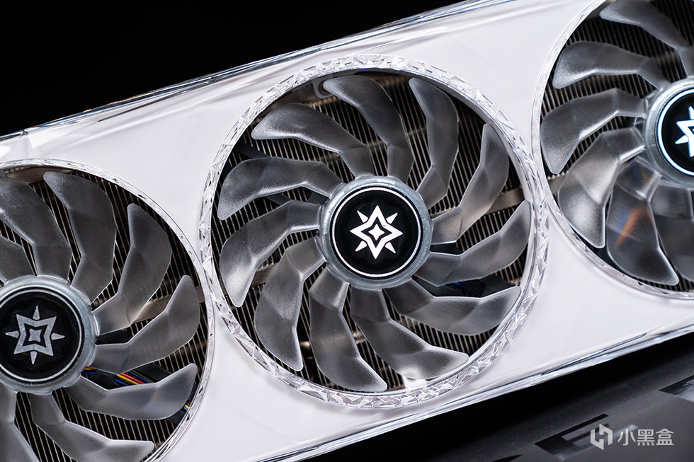 影馳 RTX 4090 星曜 OC顯卡在外觀上延續了上一代的水晶白配色,星卓 Ⅲ 新一代散熱器,配備 3 個 102*20mm 超大風扇,三折靜霜扇葉不僅強化了散熱效能還能夠折射RGB燈效果,結合水晶外殼周邊鑽石切面,進一步增強RGB燈效氛圍。
