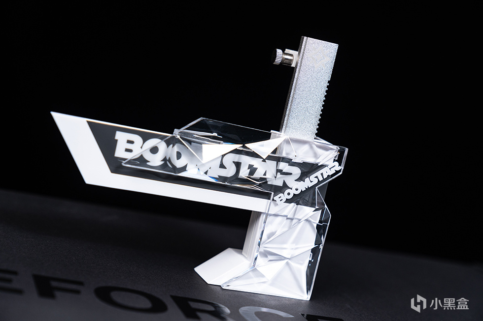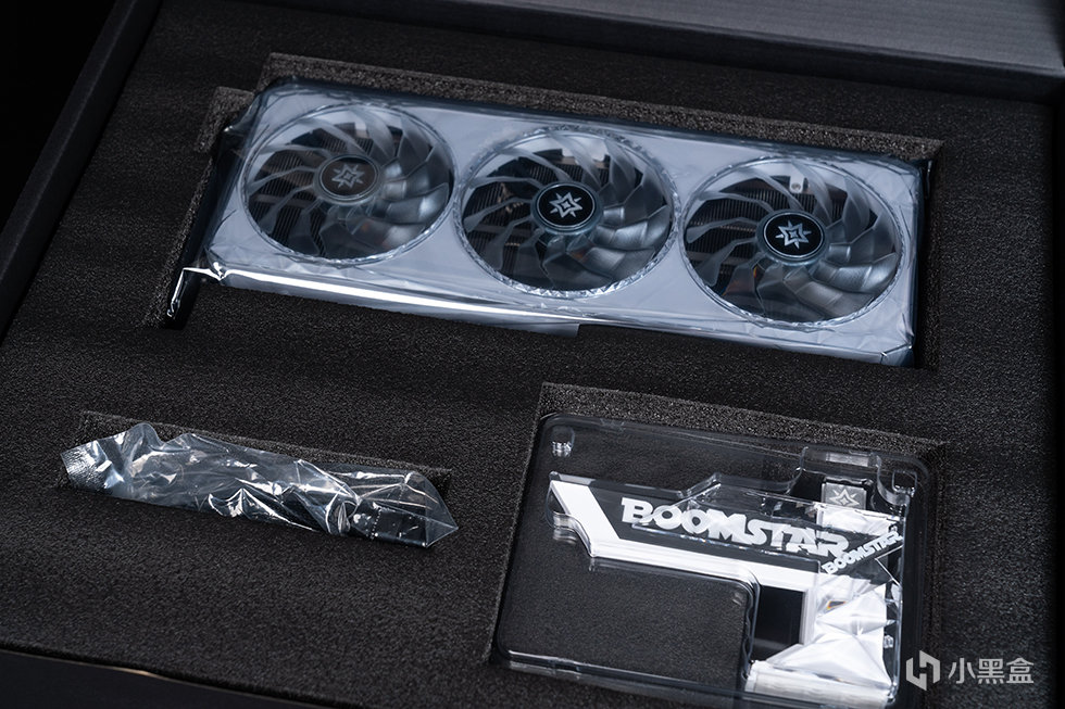 配件方面除了顯卡外,還有一個顯卡支架、2根ARGB連接線、1根12VHPWR轉 4*8Pin電源轉接線。其中ARGB燈光同步線一根是給顯卡直接使用,另一根是配合顯卡支架使用。其中顯卡支架爲星曜定製版,整體設計爲透明的外殼搭配上BOOMSTAR的標識。支持調節高度和RGB燈光同步。