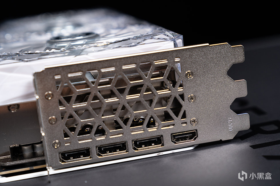 影馳 RTX 4090 星曜 OC顯卡的輸出I/O方面,採用了3個DP 1.4a接口加一個HDMI 2.1接口的配置,最高支持8K分辨率60Hz輸出。擋板還做了幾何鏤空設計,加大了出風口的面積。