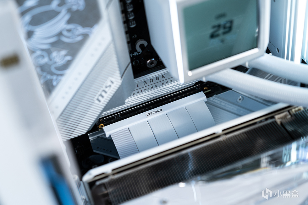 這次採用了豎裝的方案,加裝了聯力的 UNIVERSAL 4- SLOTS VERTICAL GPU KIT豎裝支架,自帶PCI-E4.0線纜。豎裝後讓星卓 Ⅲ 新一代散熱器的鑽石切面搭配三折靜霜扇葉折射出的光線能正面予以展示。