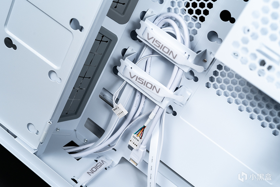 理線倉內除了有多條黏扣帶以及可以綁束線帶的架橋外,還隨附有3個雙層整線扣,可以沿着過線圈,安裝在任何地方。整線扣採C型設計,以類似SSD安裝的機制,電線夾的凹面部分可以固定來自PSU與正面IO的大型電纜,而電線夾上面的黏扣帶則是風扇纜線管理的理想位置。所有線材都可以隱藏在合頁轉軸上的纜線管理支架背面。纜線管理支架也可承載3個2.5吋的SSD,也可以安裝控制器或是ARGB集線器。