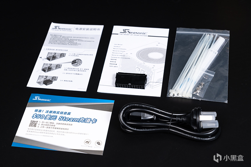 附件方面包含了說明書、使用手冊、12VHPWR模組線使用建議、Steam抽獎充值卡、紮帶、魔術紮帶、電源安裝螺絲、鋁製海韻銘牌、開機檢測器。