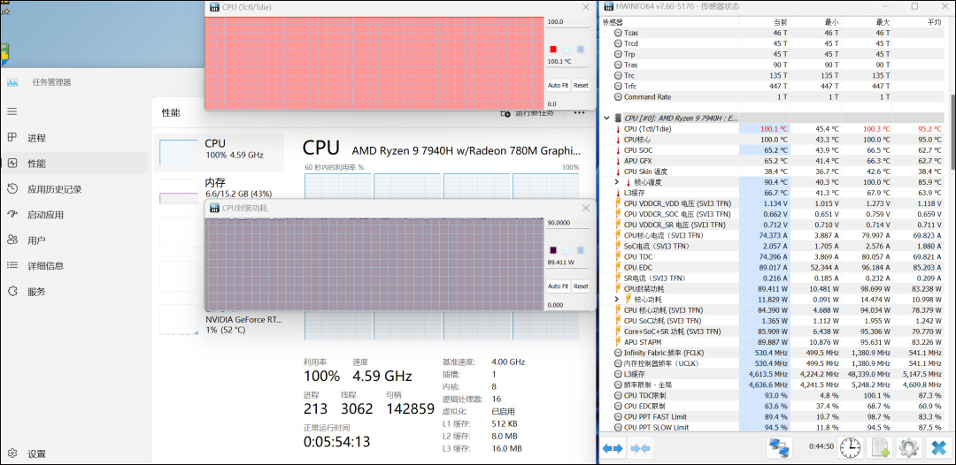依然是极速模式,室温24℃左右,单考处理器半小时以上(FPU),暗影骑士·龙处理器性能输出功率为90W,频率达到了4.6GHz左右,功率频率都非常高,而作为代价,处理器温度也不低,约100℃。这个考机功率表现,对于锐龙H处理器来说,已经是游戏本天花板级别的性能释放了。