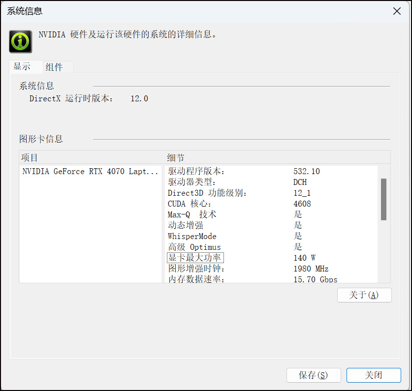 RTX 4070独显是暗影骑士·龙的主要卖点之一,而对于它,大家关心的两点都没问题:其一是支持独显直连(在英伟达显卡控制面板中切换显示模式),其二是性能释放为140W,满功耗释放。具体参数方面,RTX 4070具备4608个流处理器,8GB显存。