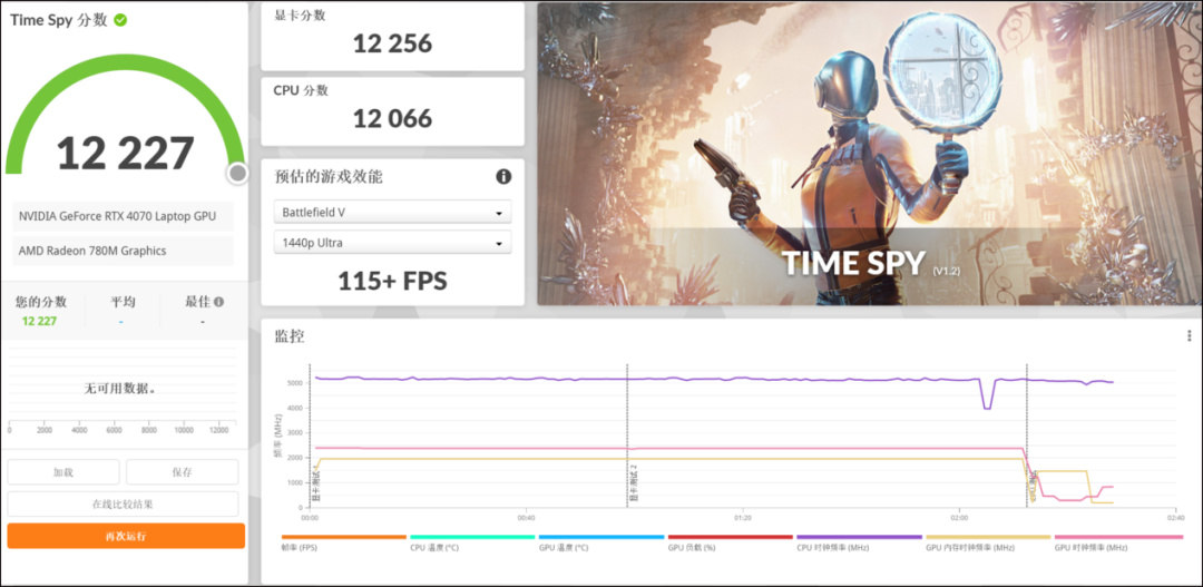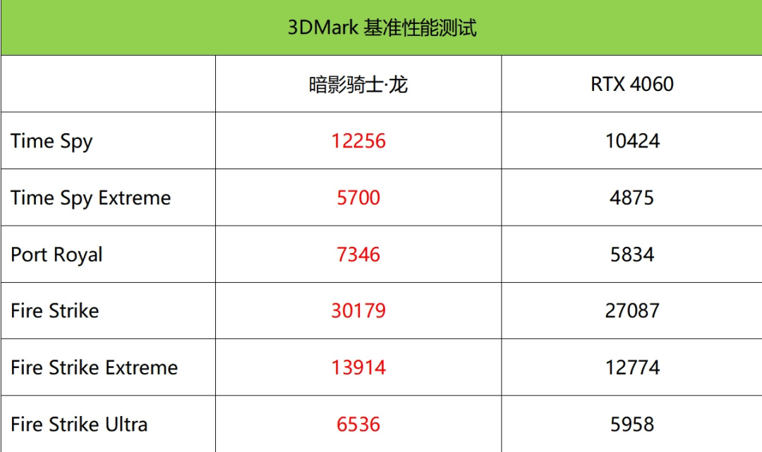 在Time Spy(2K分辨率DX 12)场景中,暗影骑士·龙的显卡得分是12256,RTX 4060是10424,RTX 4070的分数高了约17%;而在Fire Strike Extreme(2K分辨率DX 11)场景下,RTX 4070的显卡分数是13914,相比RTX 4060强9%左右。综合来看。大约是同分辨率下玩游戏,画质要强一挡的表现,或者同画质下帧速高一档,幅度不算大。那么实战性能又会怎么样?