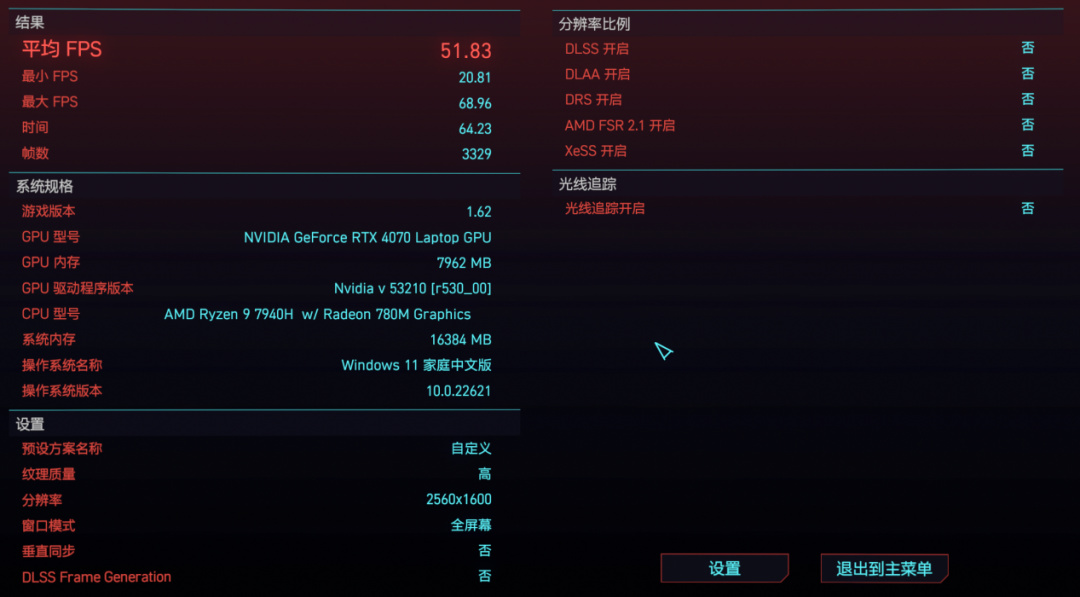 游戏实测,我们同样引入了满功耗RTX 4060和暗影骑士·龙作为对比。考虑到暗影骑士·龙搭载的是2560×1600分辨率165Hz屏,并且RTX 4070性能较强,所以我们游戏测试设置为2560×1600分辨率预设最高画质,并开启独显直连模式。