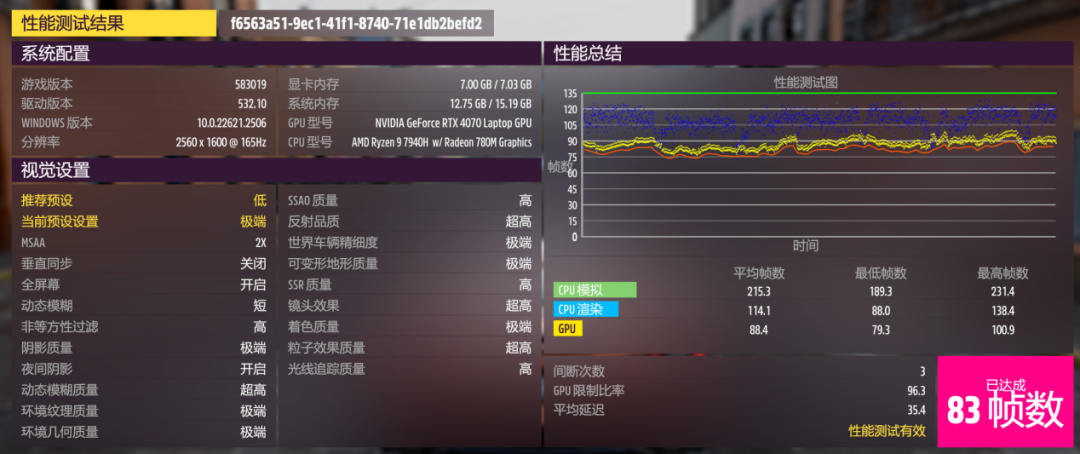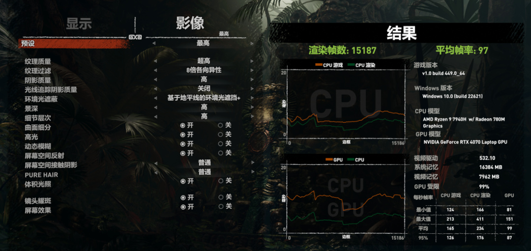 ●相对比RTX 4060,帧速提升幅度的确不算大,总体上符合之前的总结:同画质下帧速提升一挡。比如有的预算8000元左右的玩家,觉得在2.5K分辨率下,RTX 4060的帧速不能令人完全满意,那么现在RTX 4070游戏本其实就是一个可以关注的选择:价格稍高,性能也强一档。