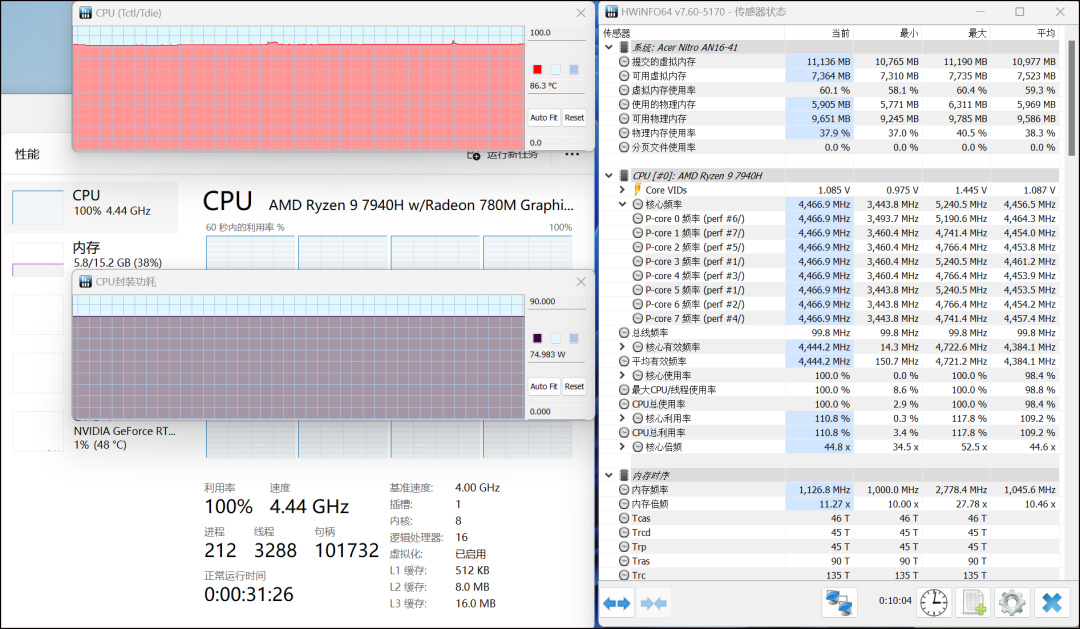 总的来说,暗影骑士·龙压住这颗锐龙9 7940H问题不大,并且具备非常强力的性能释放,极速模式下能飙到90W,性能模式下也维持75W性能释放,应对渲染、剪辑、建模、游戏等专业或者重度应用都没有问题。