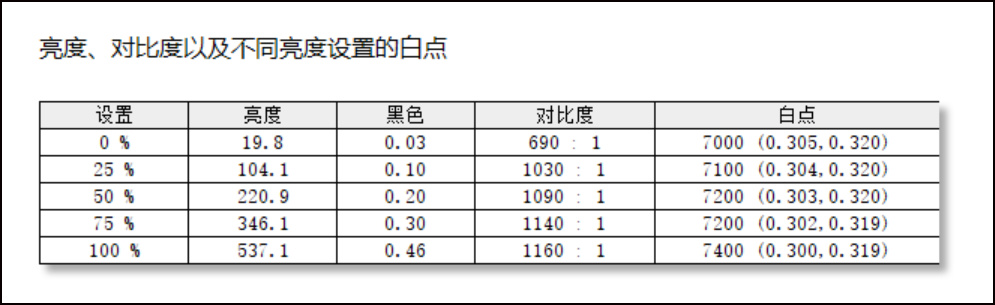 实测屏幕素质为色域98%sRGB,屏幕48色色准平均值0.8,最高亮度为537尼特——亮度的确很高,室内办公室环境下,将屏幕亮度设置为70%即可完全满足使用需求。