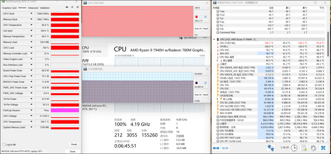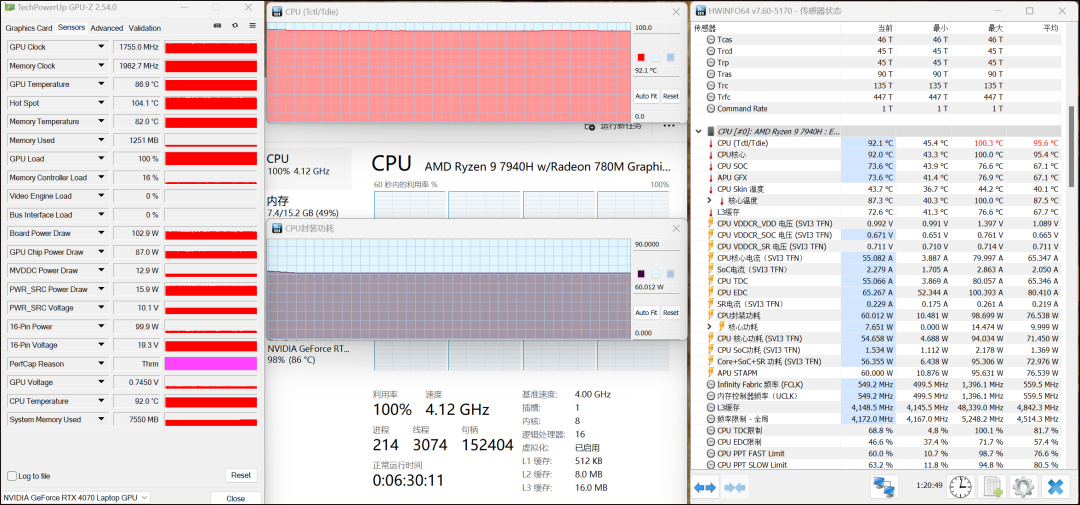 室温24℃左右,对暗影骑士·龙进行双考测试,半小时之后的情况如下所示:锐龙9 7940H功耗约60W,温度92℃,RTX 4070功耗约100W,温度约87℃,极速模式下基本能保持整机160W左右的性能输出(小提示:玩游戏时的功耗分配会倾向于独显)。