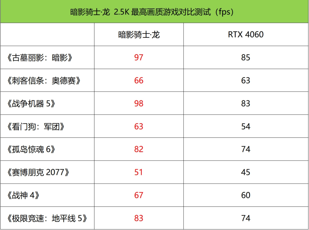 ●2.5K最高画质游戏性能测试中,暗影骑士·龙基本上都跑到了60fps以上的平均帧速,搞定2.5K最高画质3A游戏基本妥当。有的玩家会说,像《赛博朋克2077》这种平均帧速51fps的游戏流畅度咋样?51fps属于可以玩的水平。另外:近几年新出的热门3A大作基本都支持DLSS,比如《赛博朋克2077》开启DLSS 3质量之后,平均帧速会飙升到82fps,搞定2.5K,还是很稳妥的。