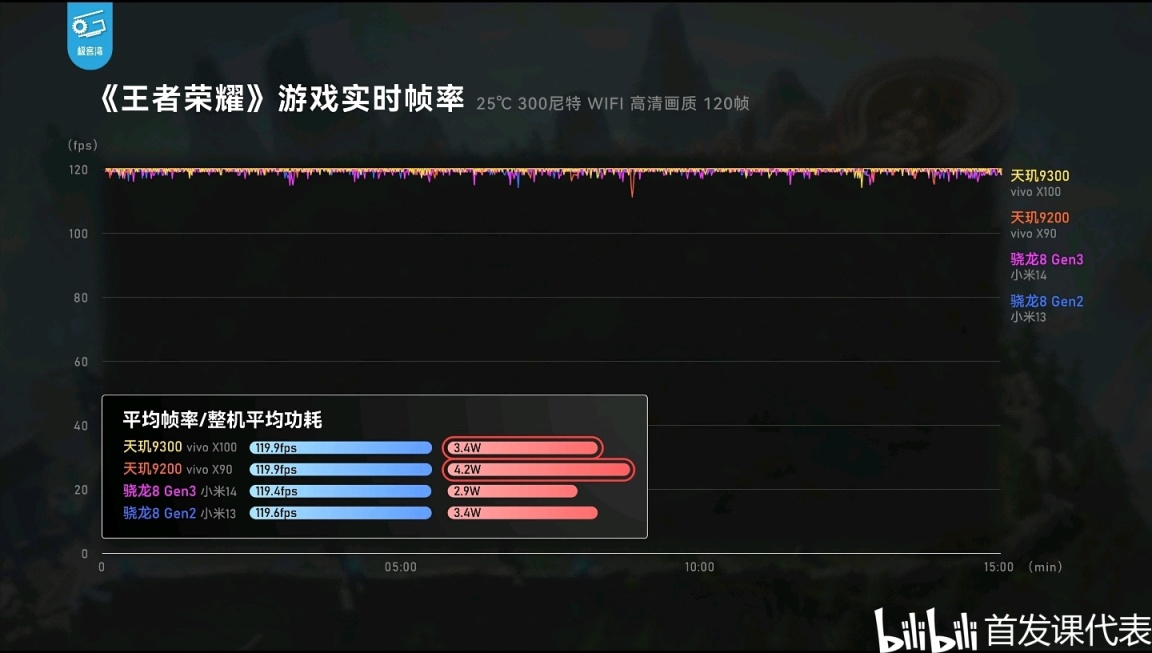 ◆ 天璣9300,於該項目中,滿幀功耗僅3.4瓦瓦,略高於驍龍8Gen3;