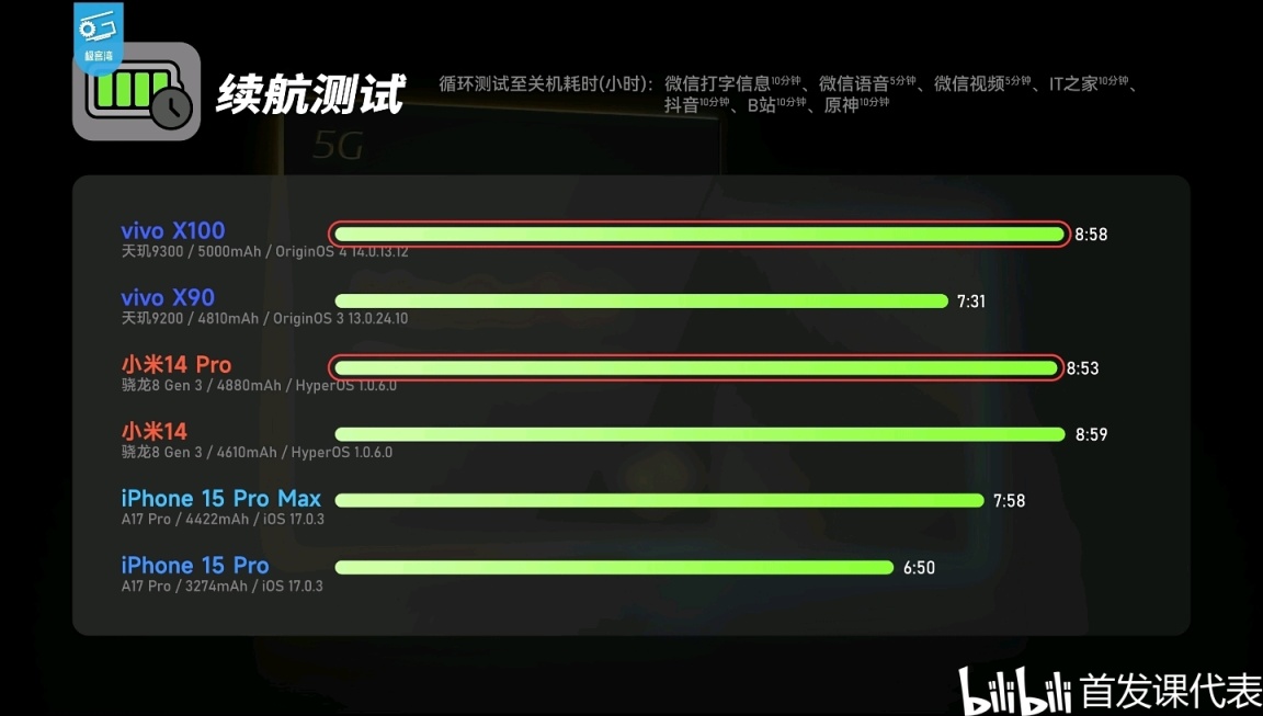◆ 該項目中,vivo X100實測續航時長爲8小時58分,相較前代X90系列提升較爲可觀。