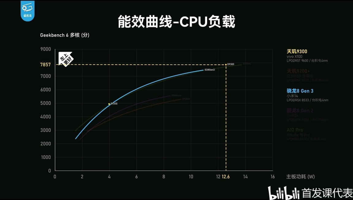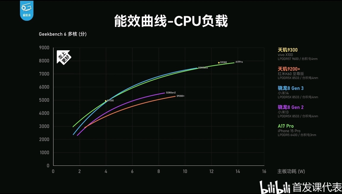 ◆ 天璣9300,中頻能效基本持平驍龍8Gen3,峯值能效,進一步領先驍龍8Gen3/A17Pro;