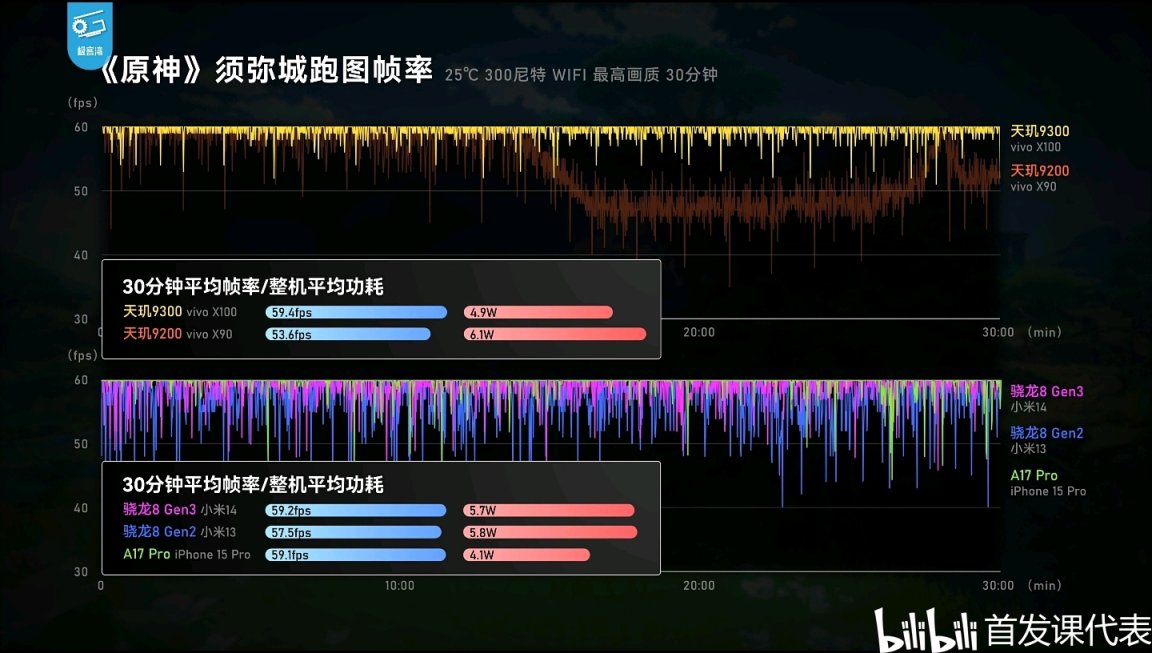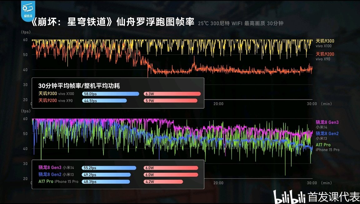 ◆ 天璣9300,於該項目中平均幀率高達58幀,平均功耗僅6.3瓦;