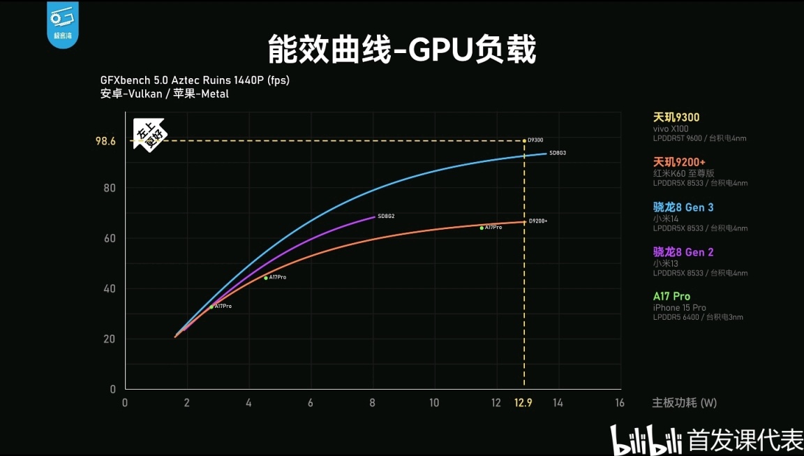 ——天璣9300量產機GPU峯值功耗約12.9瓦。(GFXbench 5.0•1440P平均98.6幀。)