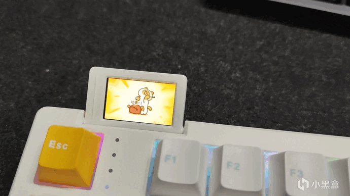 在鍵盤的左上角是鍵盤的屏幕,屏幕可以在官方下載的驅動中上傳gif動畫。在常規設計下玩家可以通過FN鍵加上<>兩個鍵盤可以操控屏幕中的一些設置選項。