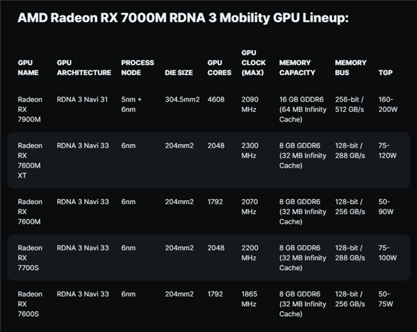 RX 7900M采用了MCM封装的大核心Navi 31,启用72组计算单元(4608个流处理器)、72个光追单元、144个AI单元、64MB二代无限缓存,显存搭配256-bit 16GB GDDR6,功耗范围160-200W。