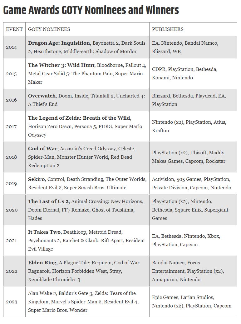 Game Rant列舉14年至今的年度最佳遊戲獲得者以及提名,知名的一線廠商如EA、CD Projekt Red、暴雪、任天堂、PS、動視和萬代南夢宮等廠商都獲得過“年度最佳遊戲”獎項,其中EA、任天堂和PS更是多次獲得該獎項。