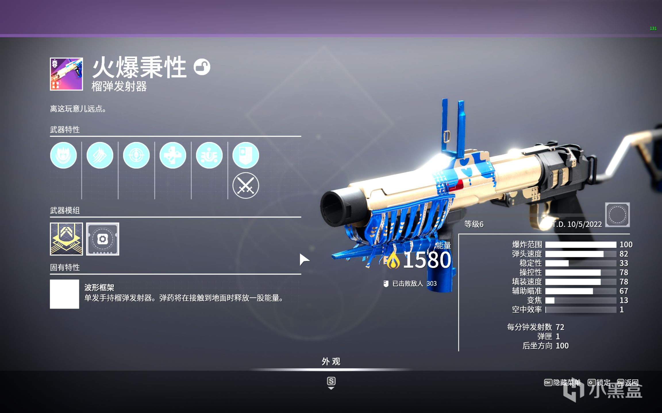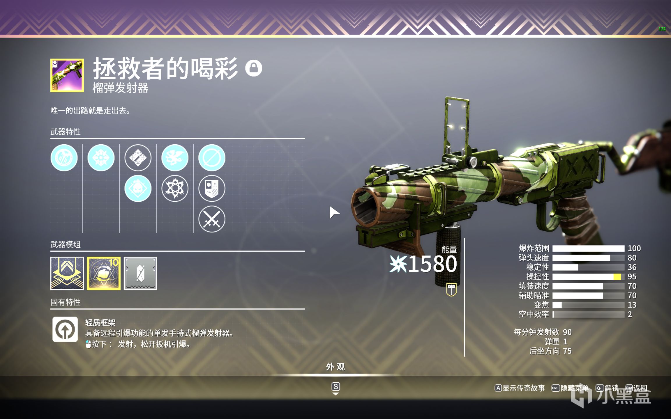 这把榴弹同样能roll出致盲自填但要单独拿出来讲一下,他有个冰属性枪械专属perk冰冷弹夹,直接命中给50%减速,当减速变为100%敌人就会被冻结。刺客野心击杀后额外填充一发弹夹可以使这把枪做到榴弹二连发,两发可以直接把勇士打冰冻。同样能做到控制的效果,并且控制力更强,配尖刺榴弹还能打出不俗的伤害,至于自填/冰冷弹夹我觉得没什么用,除非你切一个带冰冷弹夹的火箭筒不然等填好减速buff都没了。