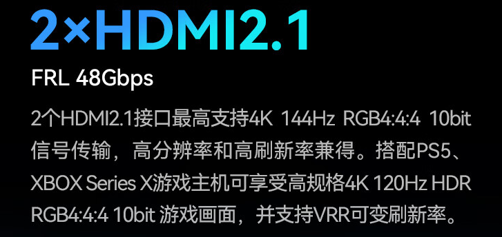 另外,顯示器是否提供HDMI 2.1接口也是一個需要重點關注的地方,只搭載DP 1.4接口的顯示器想要支持4K/144Hz的規格就必須採用雙口連接或者採用DSC壓縮技術,只有HDMI 2.1才能滿血輸出。更重要的是,搭載HDMI 2.1接口就意味着可以連接PS5、Xbox,當做遊戲主機顯示器,在這個基礎上還會有VRR、ALLM、杜比視界等功能,總之擁有的認證越多價格越貴。