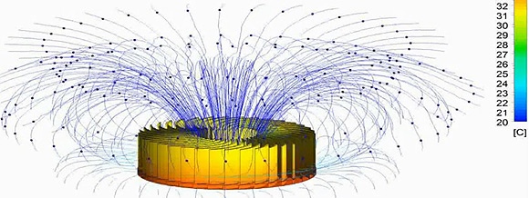 如前所述,原型“桑迪亞散熱器”通過葉輪與主體結構間的空氣間隙傳導熱量,因而間隙的面積越大,傳導效果越好。Coolchip公司在二者的表面刻上了一道道溝槽,大大增強了各自的表面積。