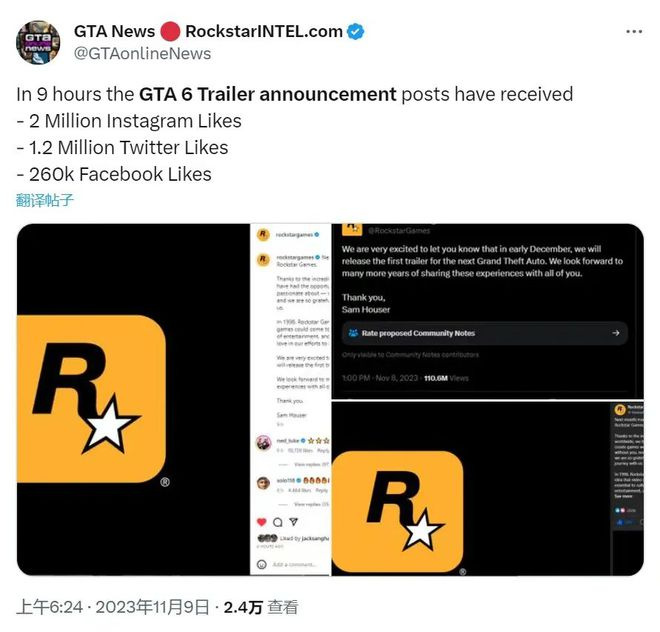R星將《GTA6》公告發布後,24小時瀏覽量超1.5億,點贊超150萬,已經突破了所有遊戲推文的記錄,並人氣持續高漲。