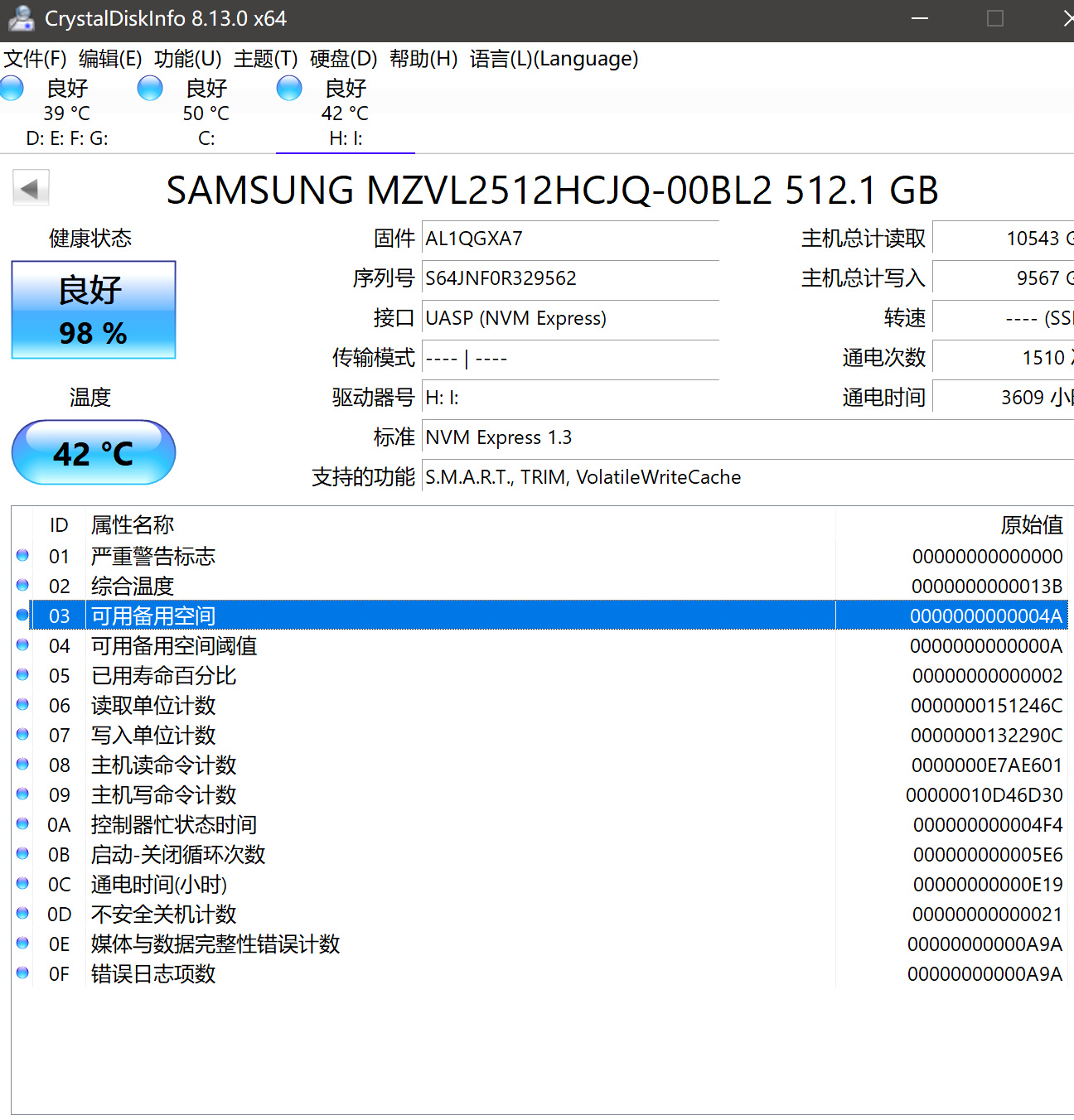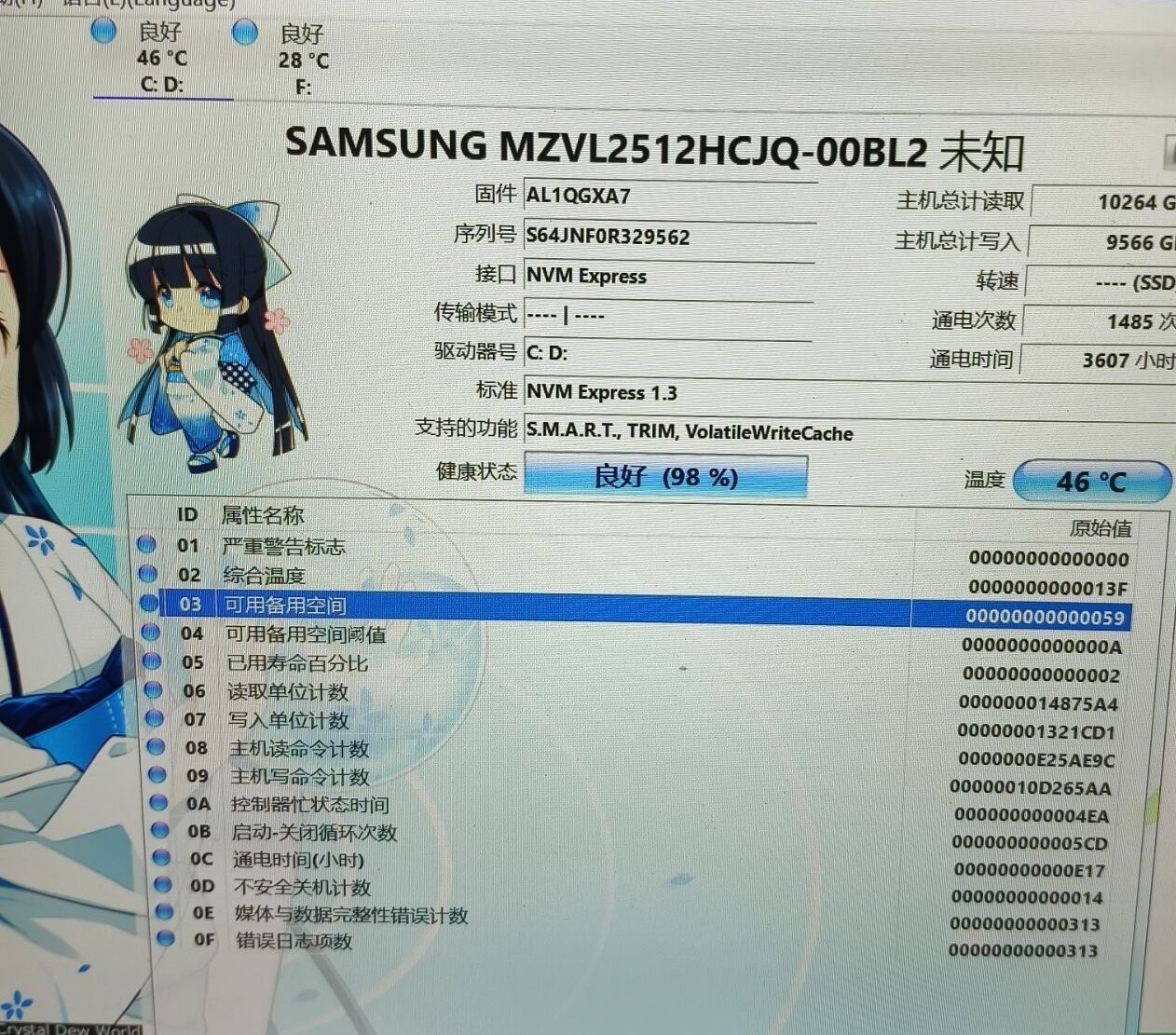 這塊硬盤只寫入了不到10TB,健康度卻已下降了百分之2。結合此前的藍屏與報錯現象,毫無疑問,硬盤已經發生了損壞。