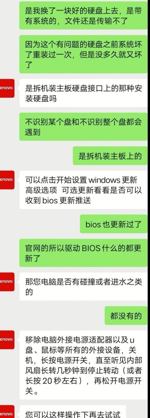 但是,聯想的官方客服也沒有給予太多幫助,他們先後提出了“檢測系統文件”、“重裝系統”、“更新驅動和BIOS”、“重置BIOS文件”等多種“解決方案”,但沒有任何一種檢測聚焦於硬盤本身。