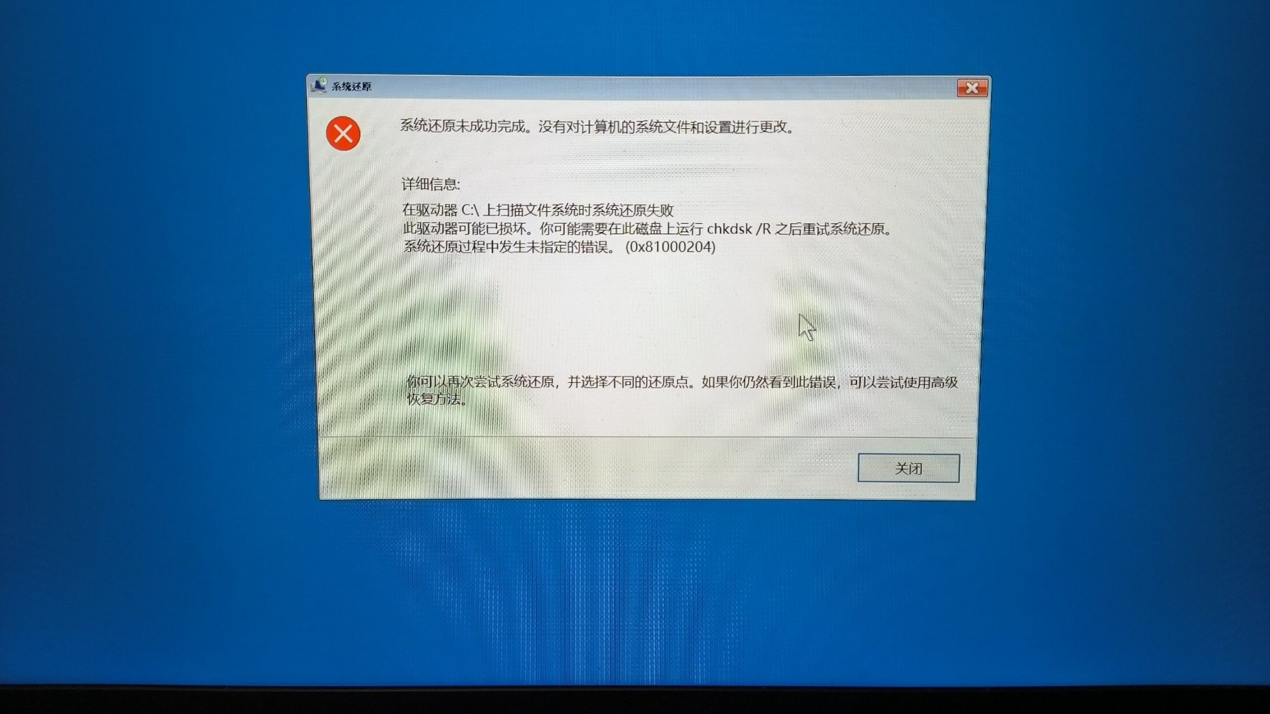 然而,系統還原的過程並沒有如預想中順利。在執行系統還原的過程中,電腦突然報錯,提示“此驅動器可能已經損壞,系統還原過程中發生未指定的錯誤”。