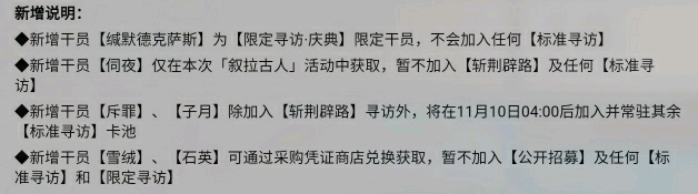 (1)限定不会加入【标准寻访】是铁律,每次都有特殊说明,比如这次的限定寻访就专门说明了【限定寻访】限定干员不会加入任何【标准寻访】。基本上之后W的获取对于多数玩家而言只有井这一条途径;