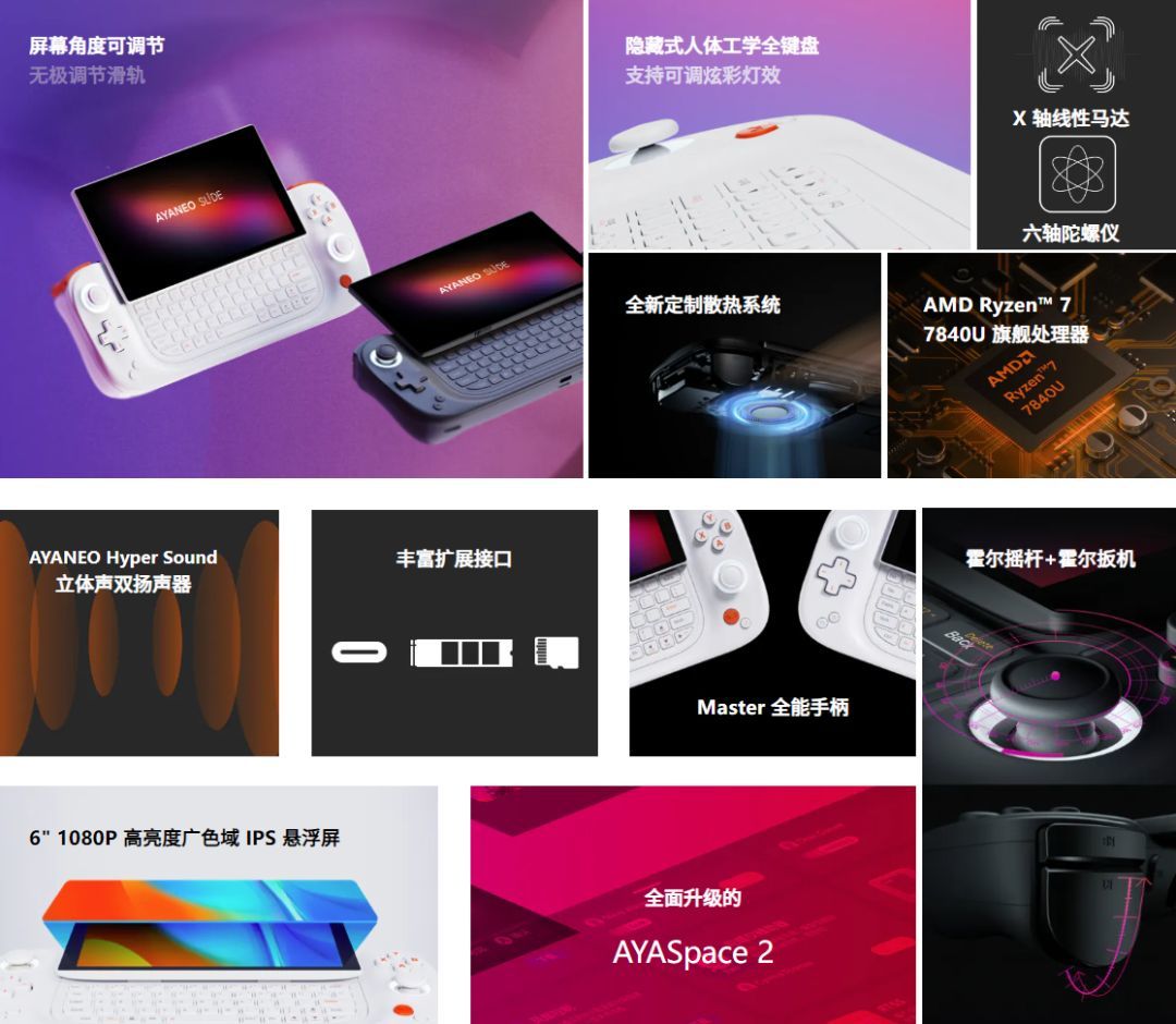 AYANEO SLIDE配备一块6英寸1080P IPS屏幕,400nit亮度,采用无极调节滑轨,搭载标准键盘,霍尔摇杆、线性霍尔扳机、双X轴线性马达、六轴陀螺仪,立体声双扬声器。