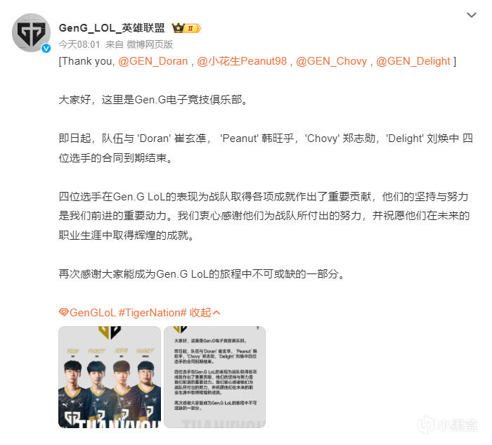 英雄聯盟GEN戰隊官宣上單Doran、打野Peanut、中單Chovy、輔助Delight、主教練Score、教練Mafa、教練Museong離隊。