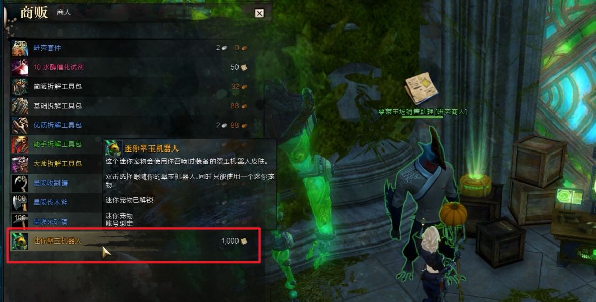 1.前往翠玉机器人工作台,在工作台身边的商人处花费1000研究记录购买【迷你翠玉机器人】。研究记录可以通过分解升华武器护甲,或者药剂的方式获取。