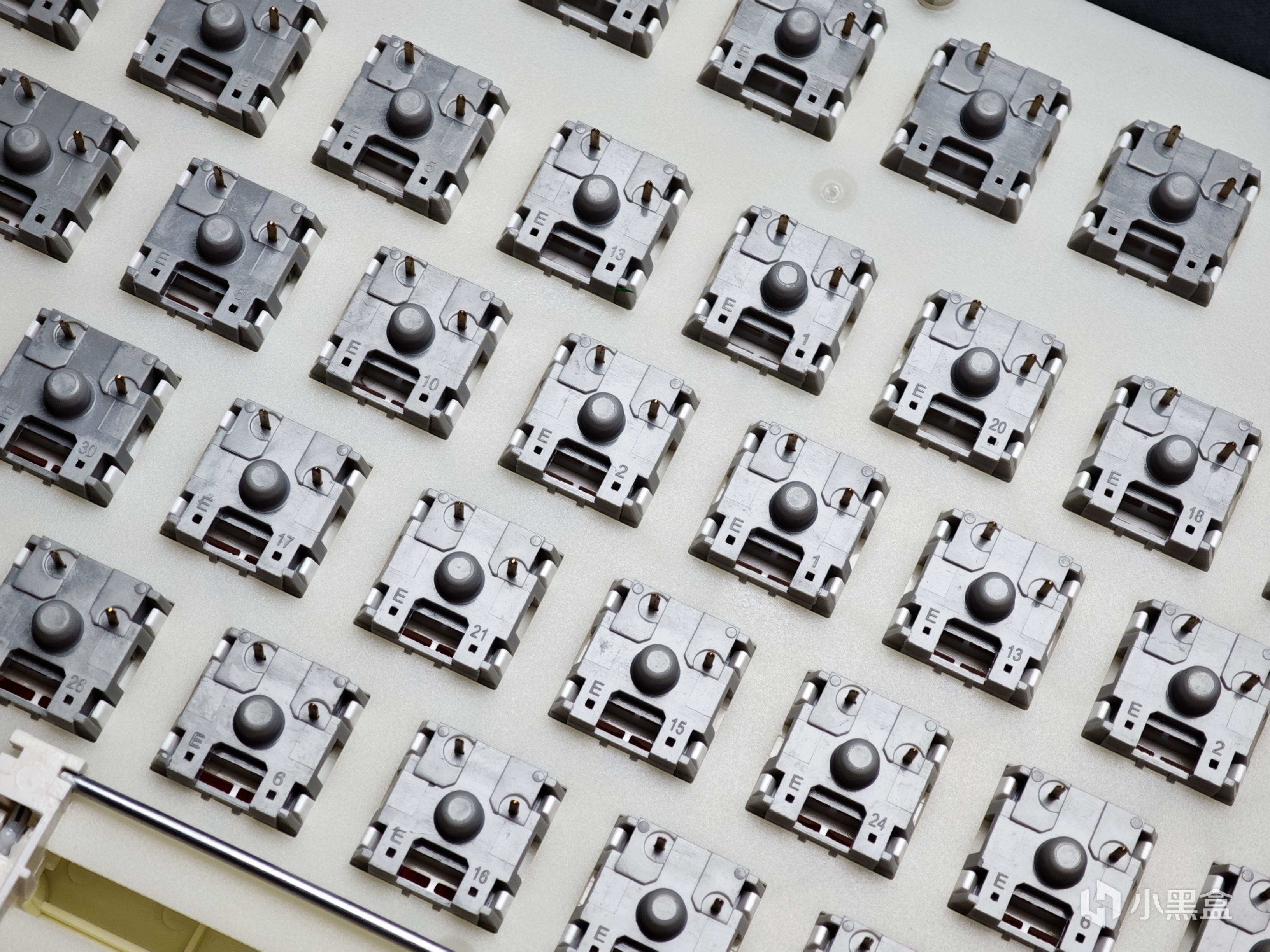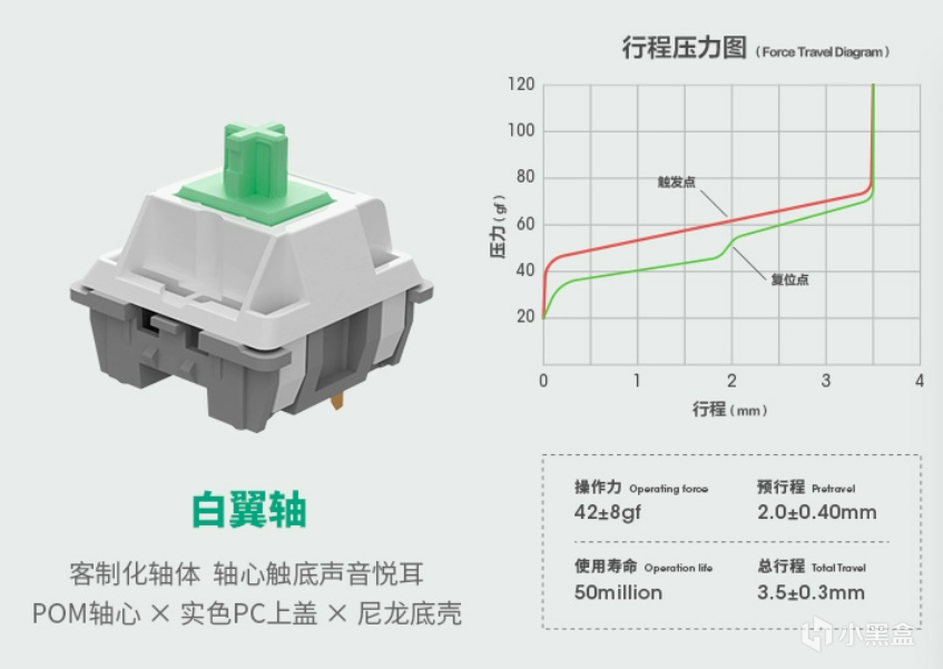 手感方面,就是很常規的線性軸手感,唯一不同的點在於行程方面,觸底行程相較於常規的紅軸來說會有些許提前,達到了3.5±0.3mm,但觸發行程依舊是2.0±0.4mm沒變。白翼軸採用的是PC上蓋+POM軸芯+尼龍底殼方案組合而成,整體算是之前很熱門的一種方案,聲音方面相較於聲優軸來說會稍微差些,但作爲這個價位鍵盤上所搭載的軸體還算可以了,最基本的手感方面也有所保證。