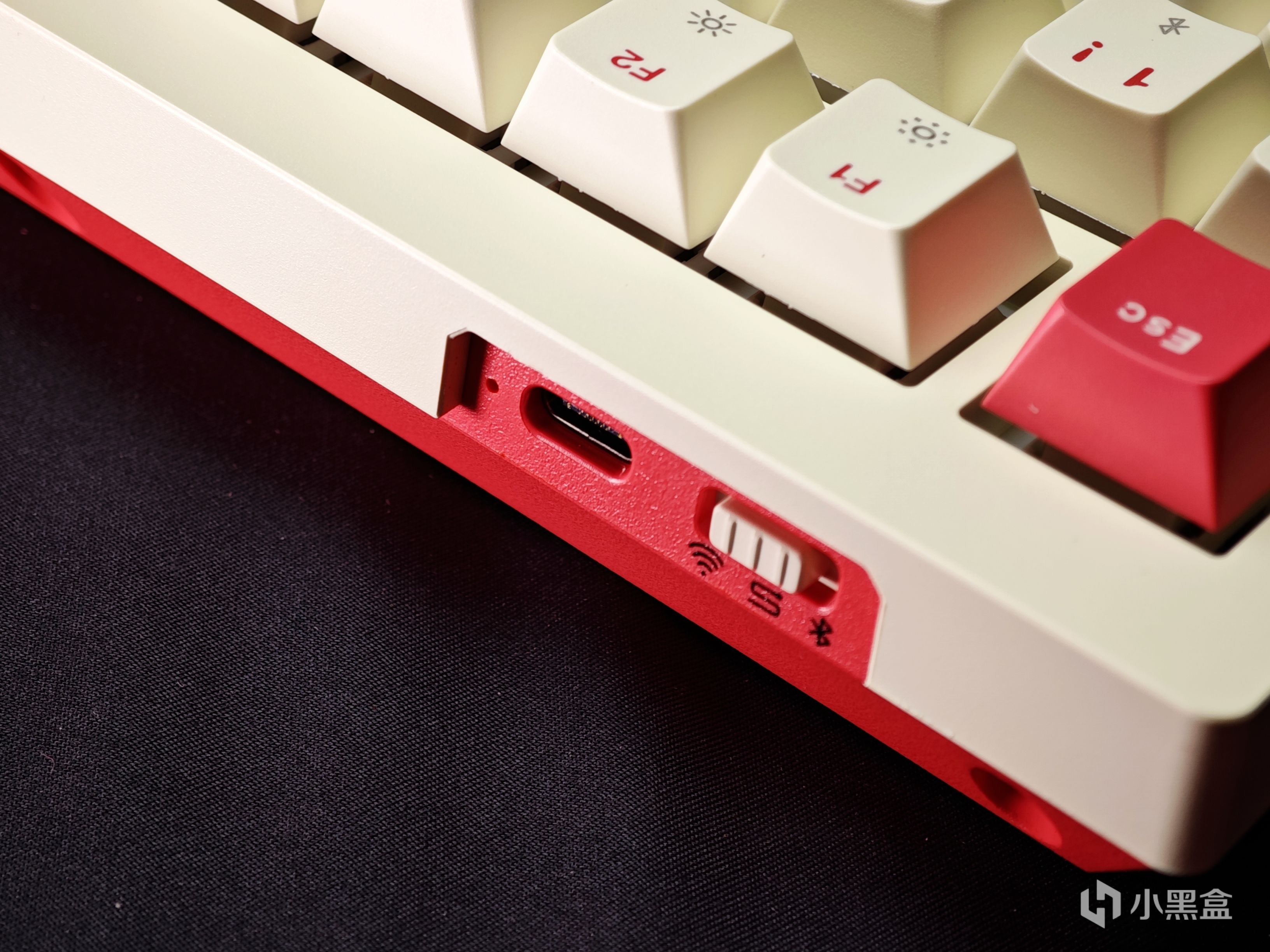 後側面能看到在偏右側的位置,有一個Type-C接口和三模切換開關,沒有像部分鍵盤一樣做在下面這點很不錯,但問題也來了,沒有接收器收納倉的位置。