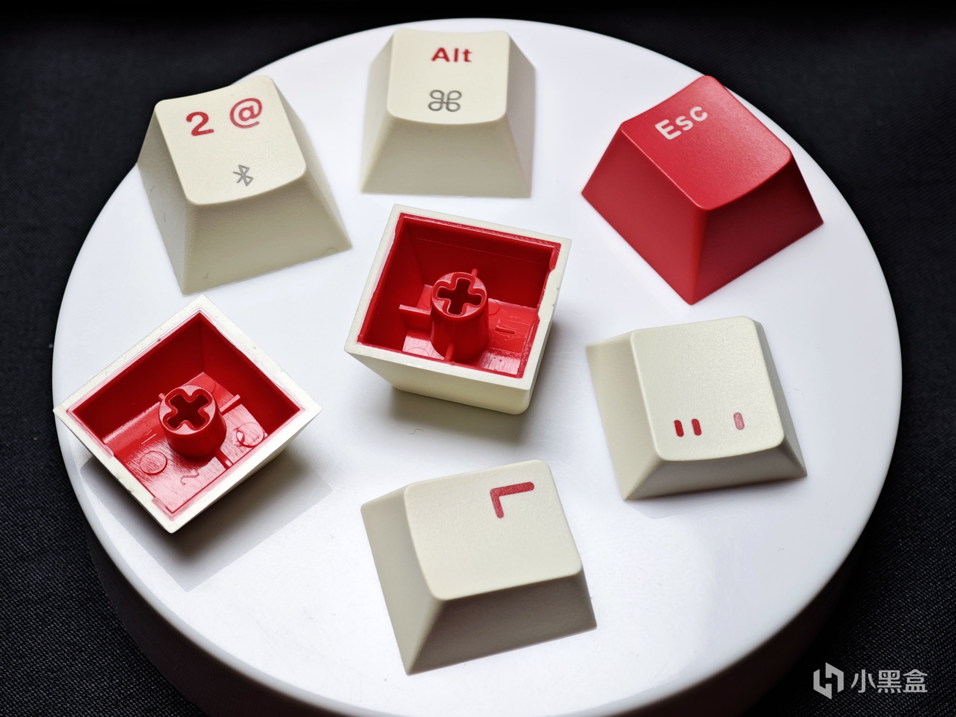 當然在其他方面,兩款鍵帽基本是一致的,均採用PBT材質製成,雙色注塑工藝,唯一不同的區別也就在配色上面了。高度方面則是採用了原廠高度,也是目前最常見的鍵帽高度之一了。除此之外能看到部分按鍵上有對應的組合鍵提示,這一點很不錯。