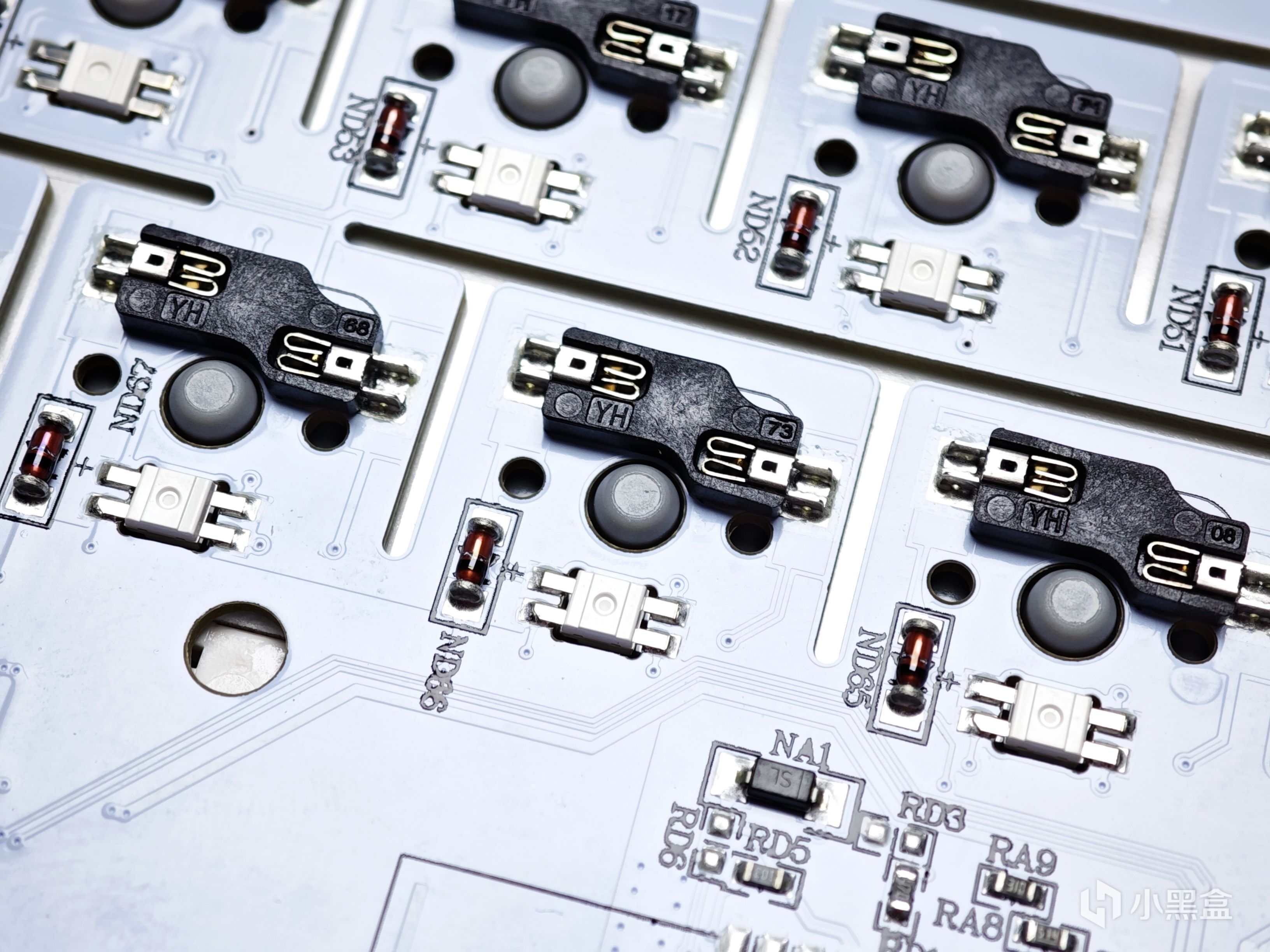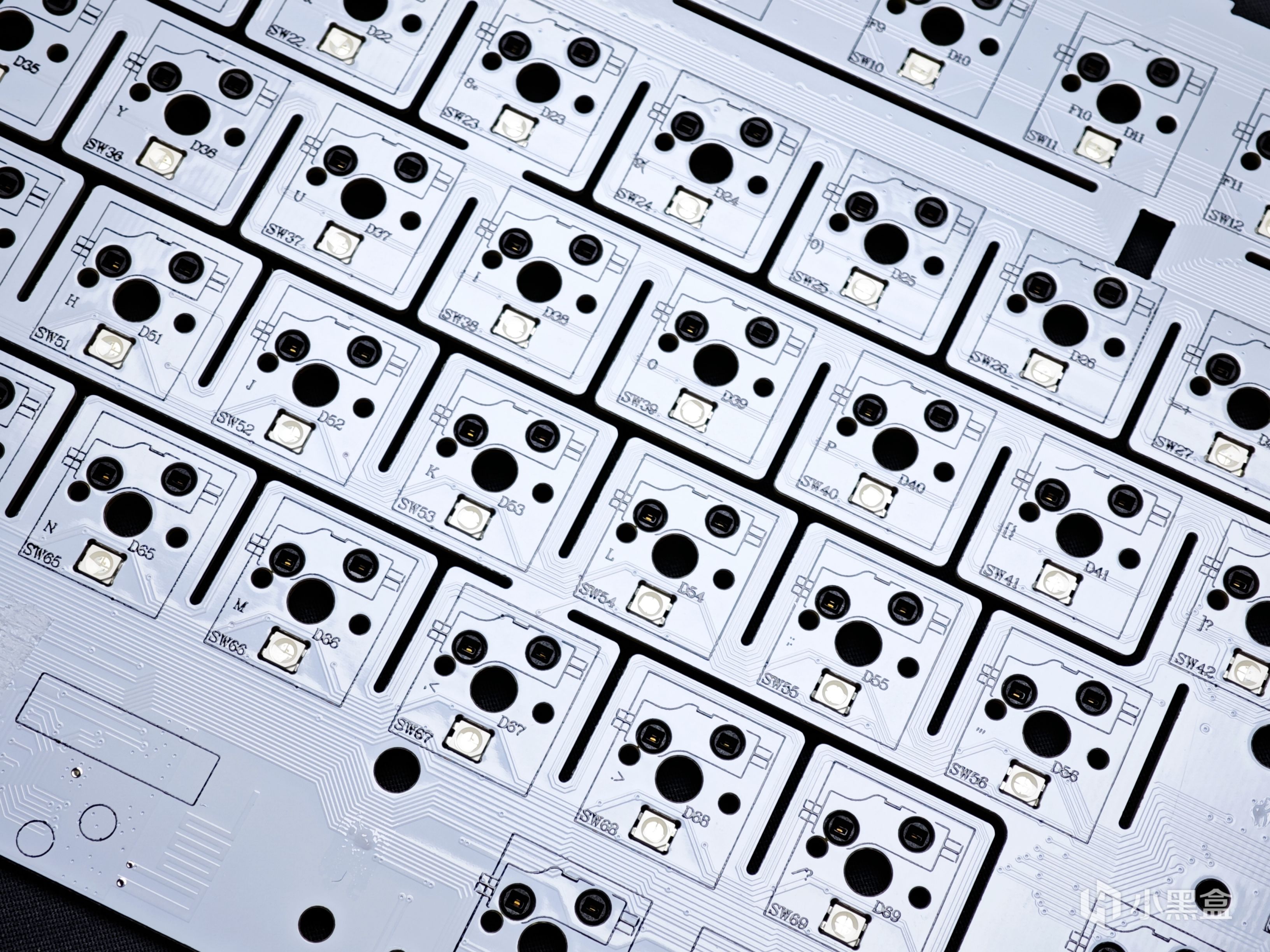 PCB採用的是單鍵開槽的配置,同時可以看到採用的是軸座熱插拔,支持三腳/五腳的機械軸體熱插拔,軸座品牌採用的是YH的軸座。燈位方面採用的是下燈位。