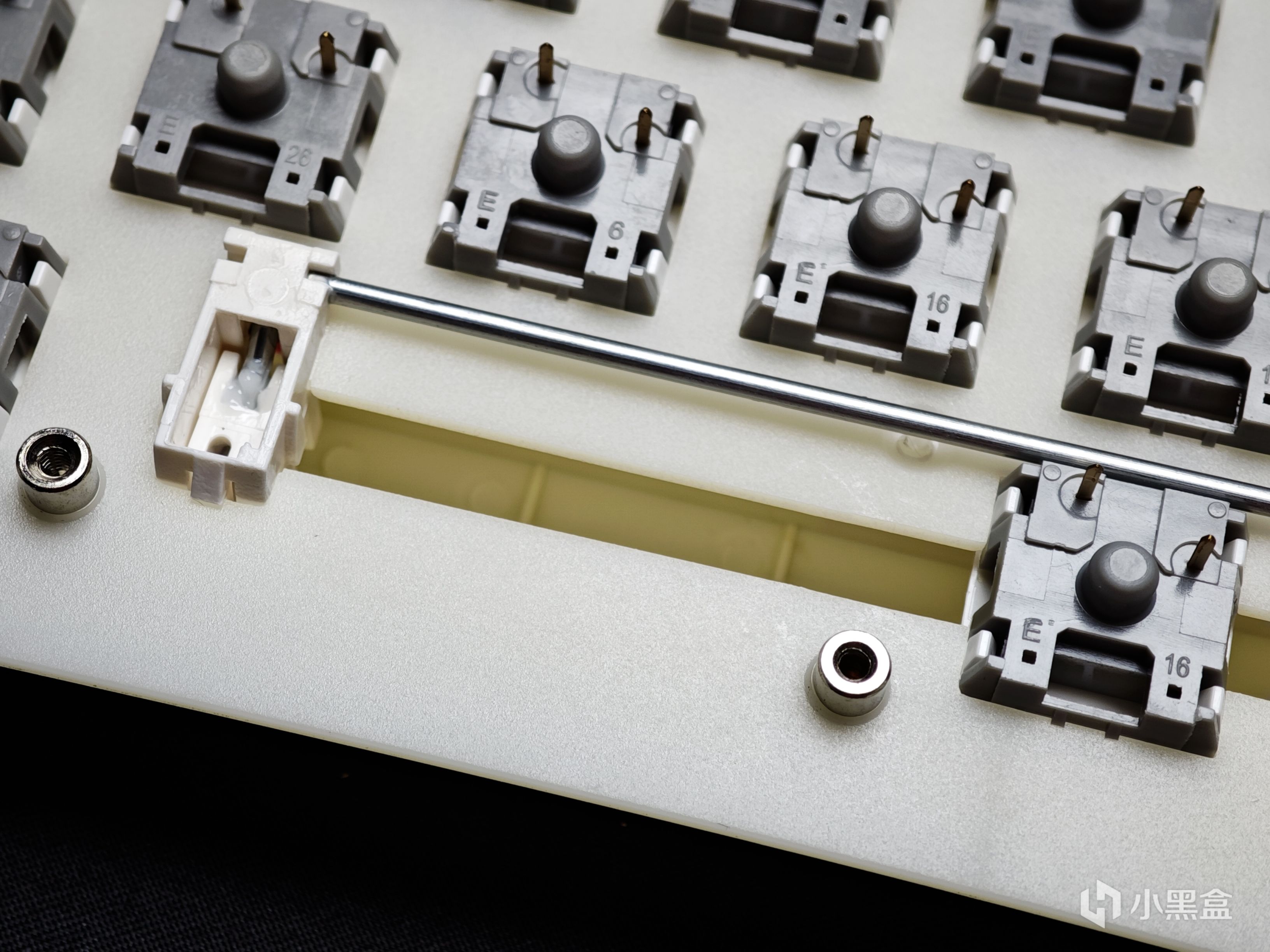 衛星軸方面採用的是鋼板衛星軸,沒記錯的話一代使用的是PCB衛星軸,二代改成了鋼板衛星軸。整體的素質方面還算不錯,我這把除了空格右側有較重的鋼絲音之外其他幾個完全沒問題,潤滑方面也有給到位。
