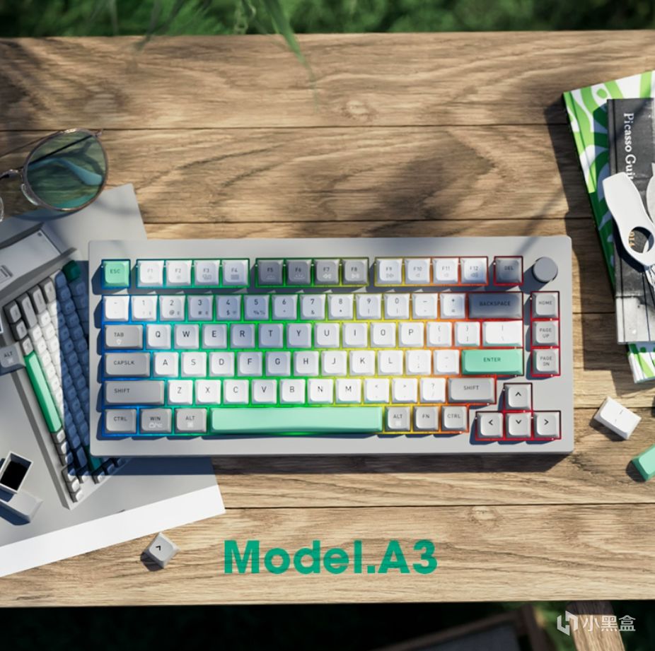 鍵帽方面,依舊是跟着鍵盤的配色來變換的,目前A3 2.0有兩種配色可選,一種是雪天青(灰色套件),另一種就是圖中的瑰奇配色(暖白套件),鍵帽也可以參考下圖。