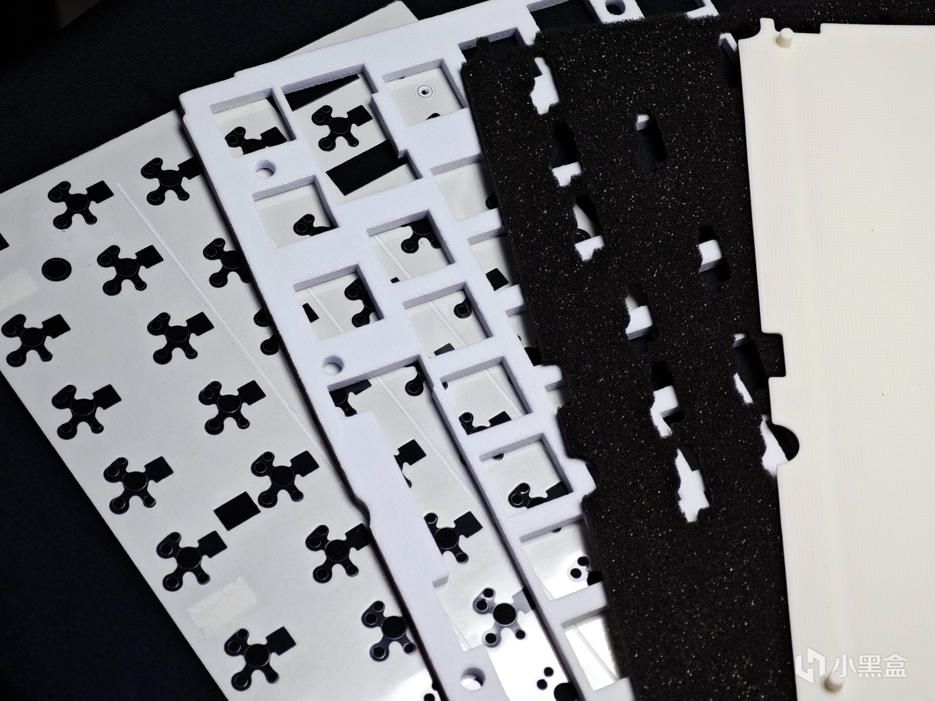 定位板方面,採用的是實色PC定位板,整體並沒有進行開槽,在手感方面相較於目前採用橫向開槽以及單鍵開槽的一些鍵盤稍硬一些,但得益於墊片的形狀,這一點應該是各有千秋的。