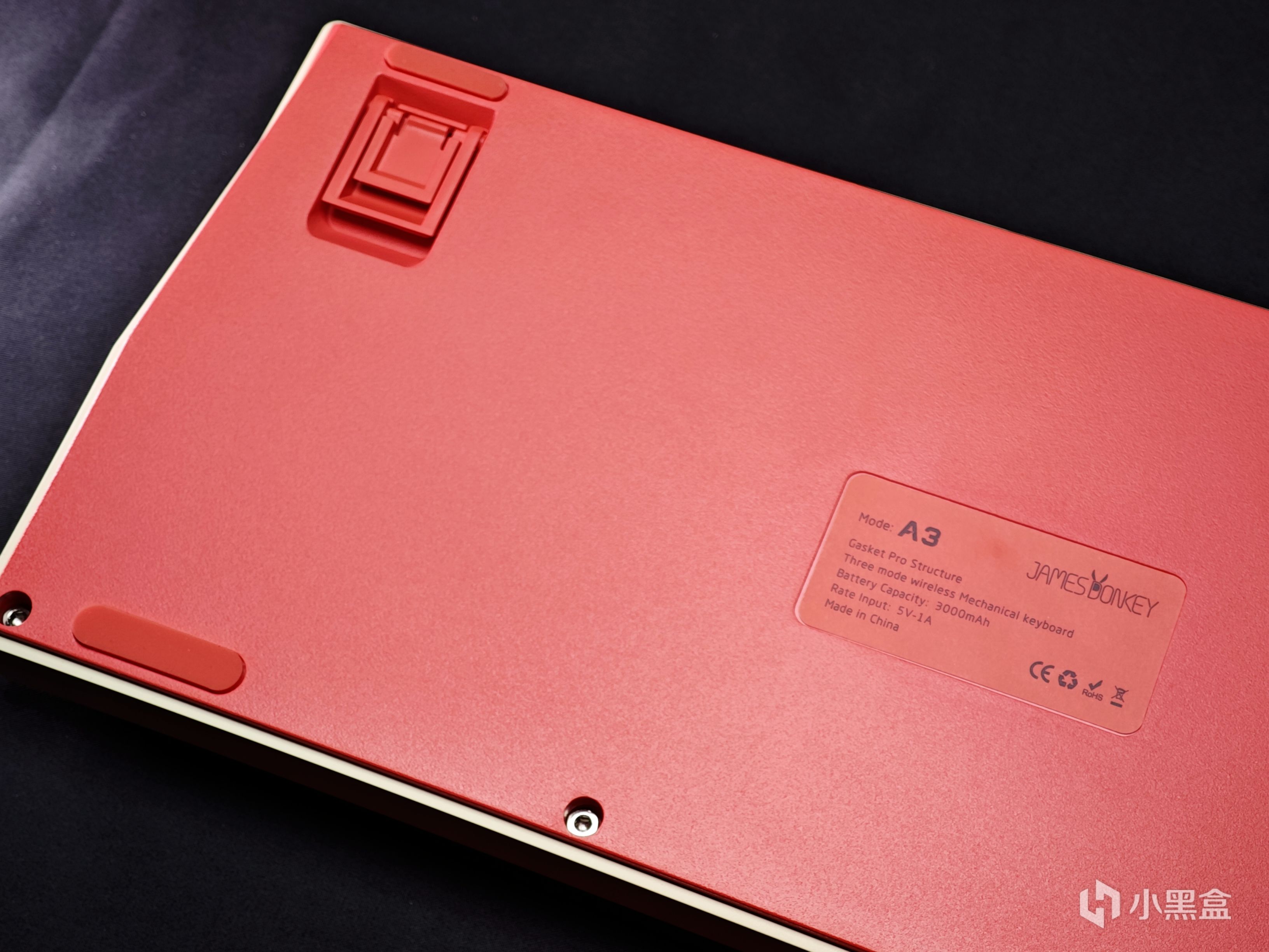 底部就是正常的拼色底殼,採用的是大紅色,整體顏色搭配方面還是很不錯的,常規的防滑貼以及二段腳撐也都有配備,最基礎的貼紙也在中間好好放着,不過依舊是沒有收納倉的存在,如果經常使用2.4G模式的話最好別亂放。