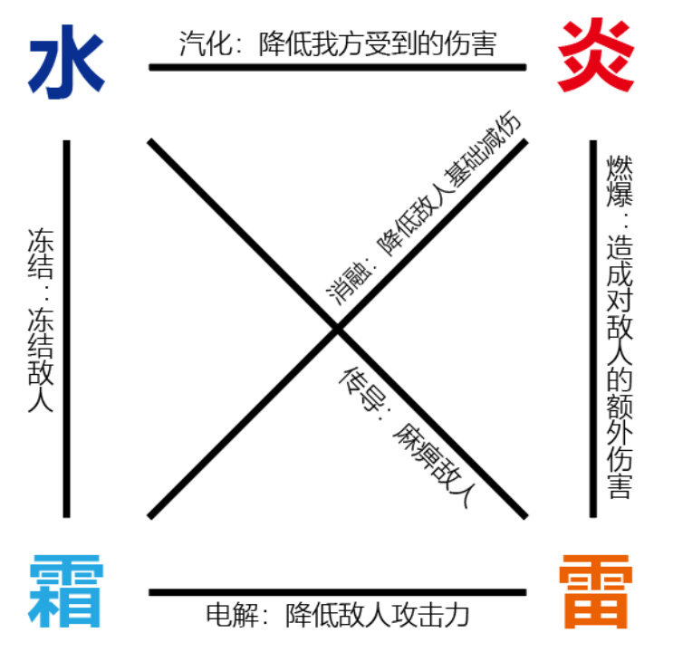 更吸引人的樂趣在於元素之間的交互反應。《白荊迴廊》只有4種元素參與交互,分別是水、炎、霜、雷元素。當角色處於任一元素區域、並受到另一種元素攻擊時,便會產生汽化、燃爆、傳導等6種效果。換句話說,這4種元素任意搭配都能發生交互反應,提升了發生交互的頻率。