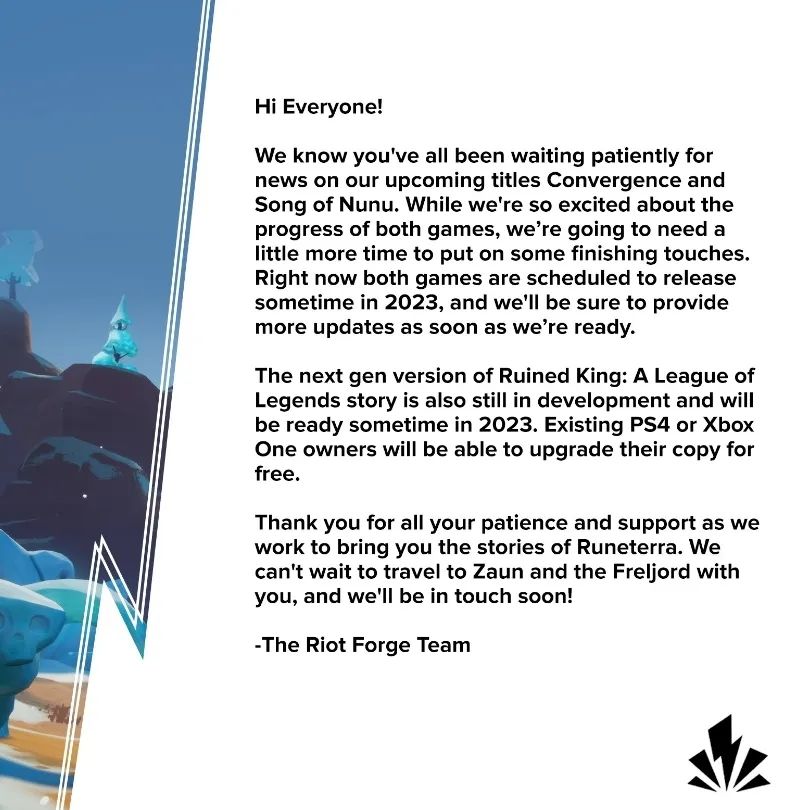 去年11月的拳头游戏发布会上公布了4款LOL衍生作,其中以吉格斯为主角的音乐跑酷游戏《海克斯炸欢天:英雄联盟外传》,《战神 夜袭》开发商Airship Syndicate制作的RPG游戏《破败王者:英雄联盟外传》都已先行发售,而另外两款游戏原计划今年推出: