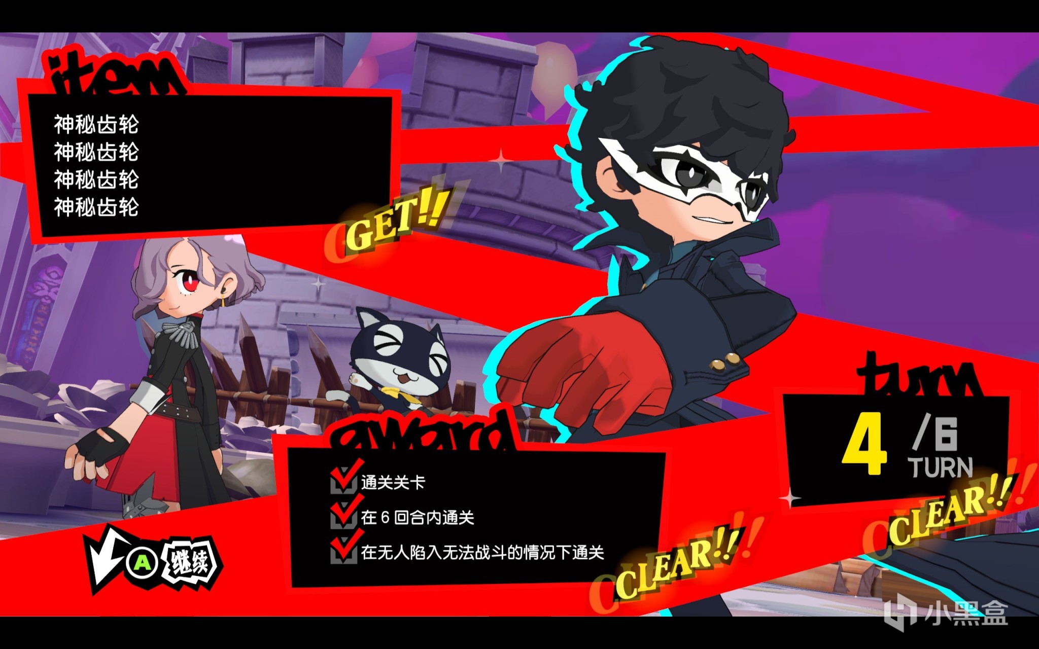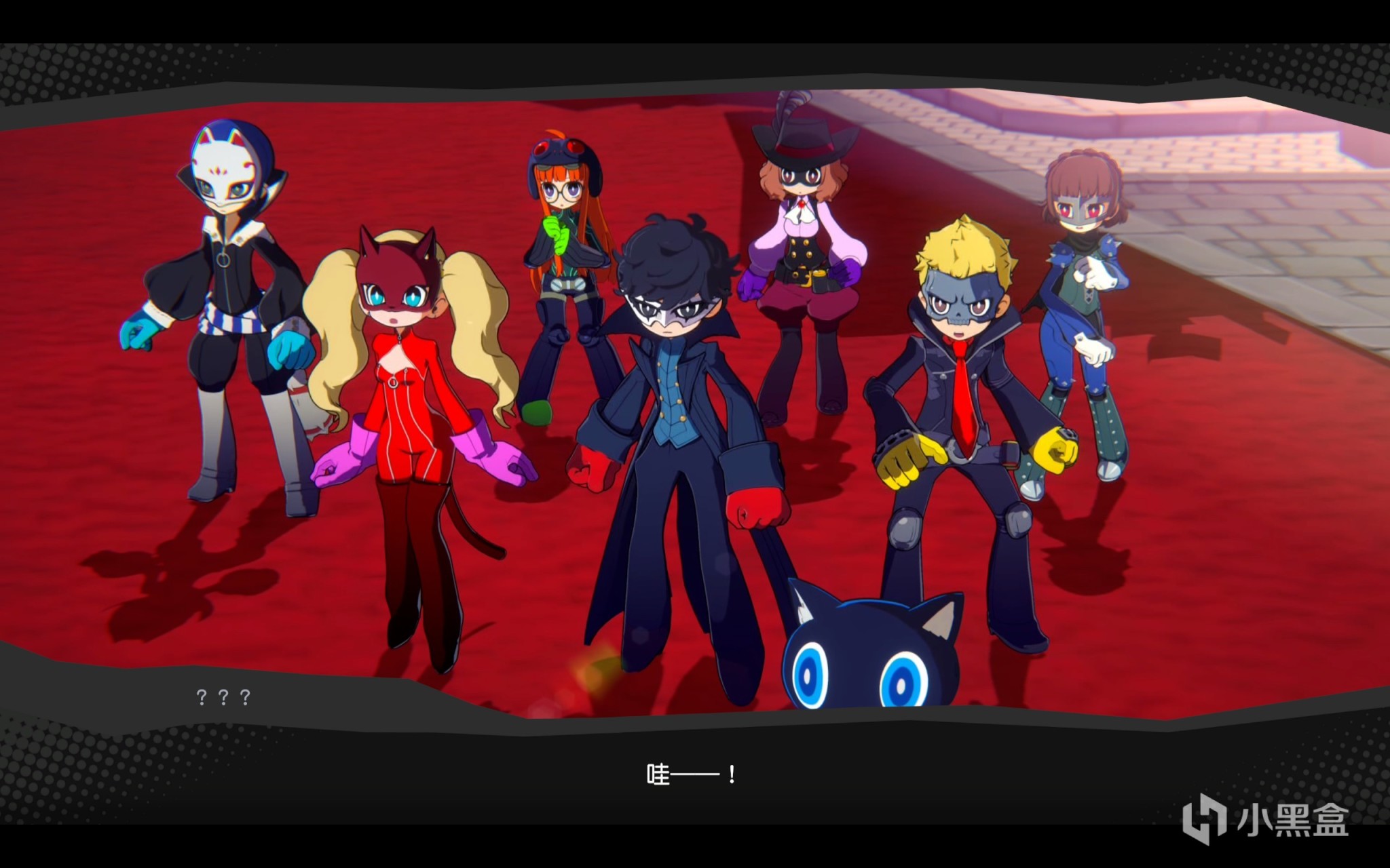 進入遊戲,本作P5系列特色黑紅美術風格配合誇張的漫畫式線條,使得整個UI界面富有張力,場景華麗,一下子P5的味道就體現出來了,而與本篇線條鮮明帥氣的心之怪盜團不同,本作的主角們採用了卡通可愛的人物建模和立繪,人物與本篇形成了一個強烈的反差,有一種反差萌的美感,Q版小人可愛的同時也保留了P5的系列特色,依舊有着紅黑的配色,鮮明的線條,觀感也相當不錯。
