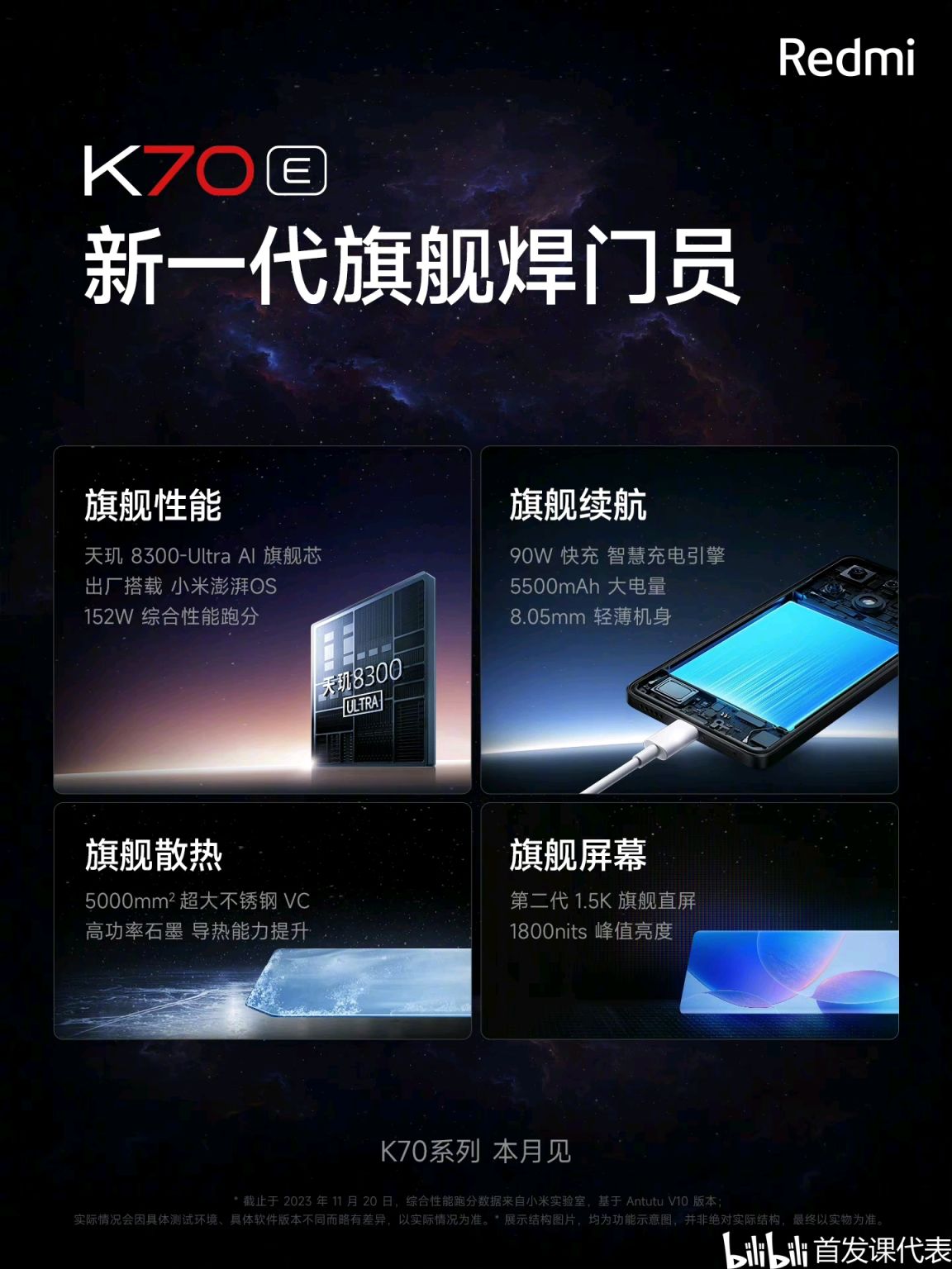11 月 22 日消息,Redmi K70 E 今日預熱了部分核心規格參數: